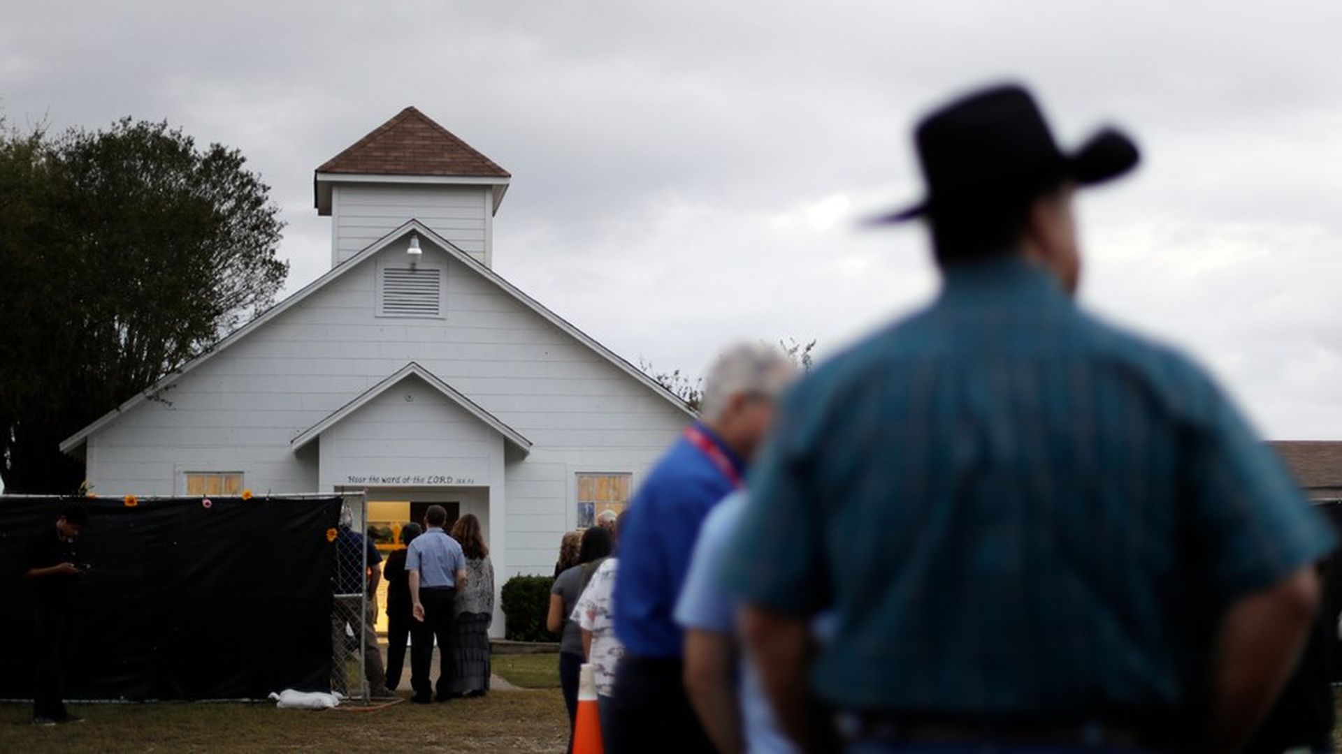 A group wait in line to enter the Sutherland Springs Baptist Church to view a memorial. Photo: Eric Gay / AP