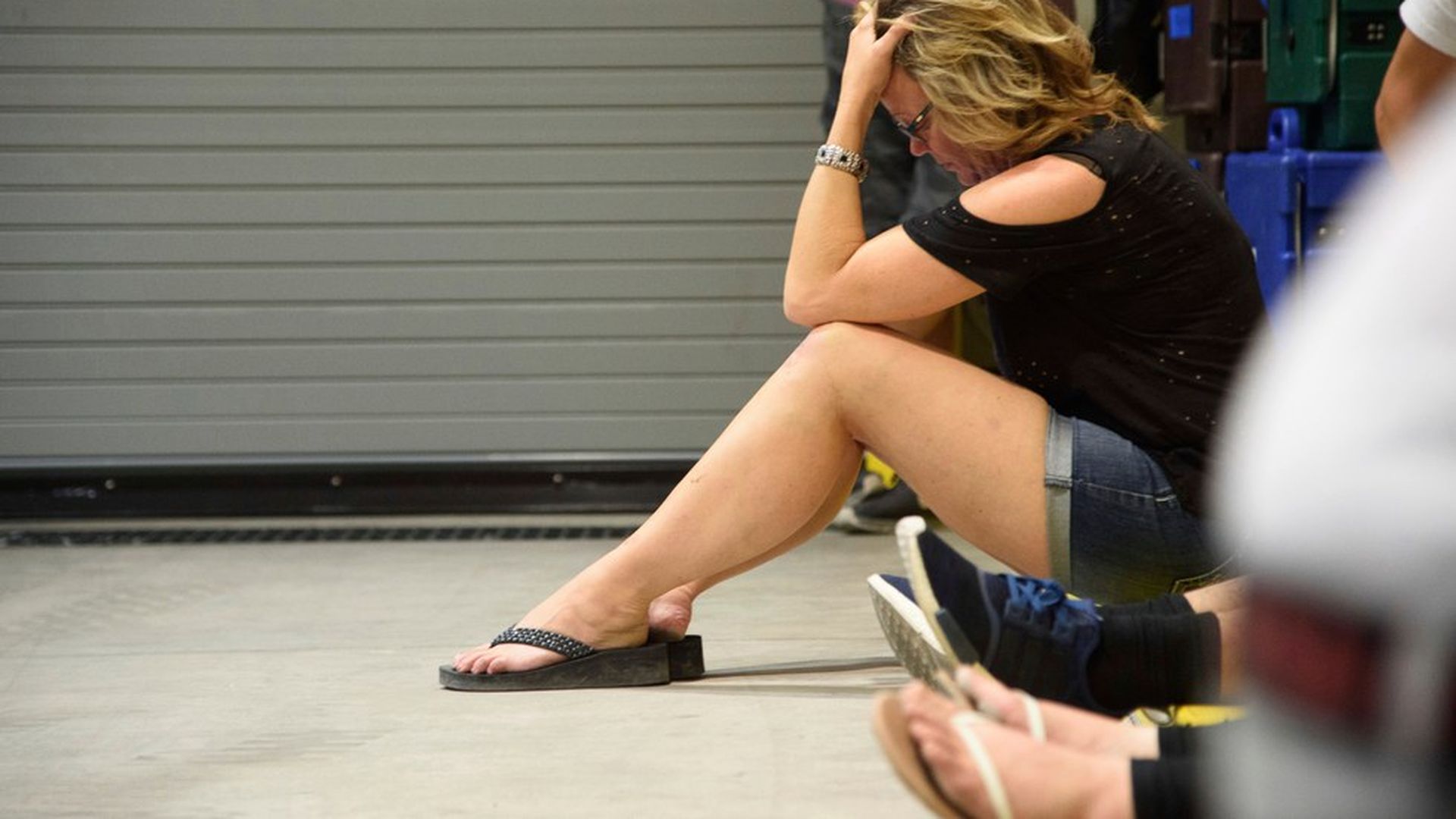 A young woman hides inside the Sands Corporation plane hangar after a gunman opened fire at the Route 91 Harvest Festival. Photo: Powers Imagery / Invision / AP