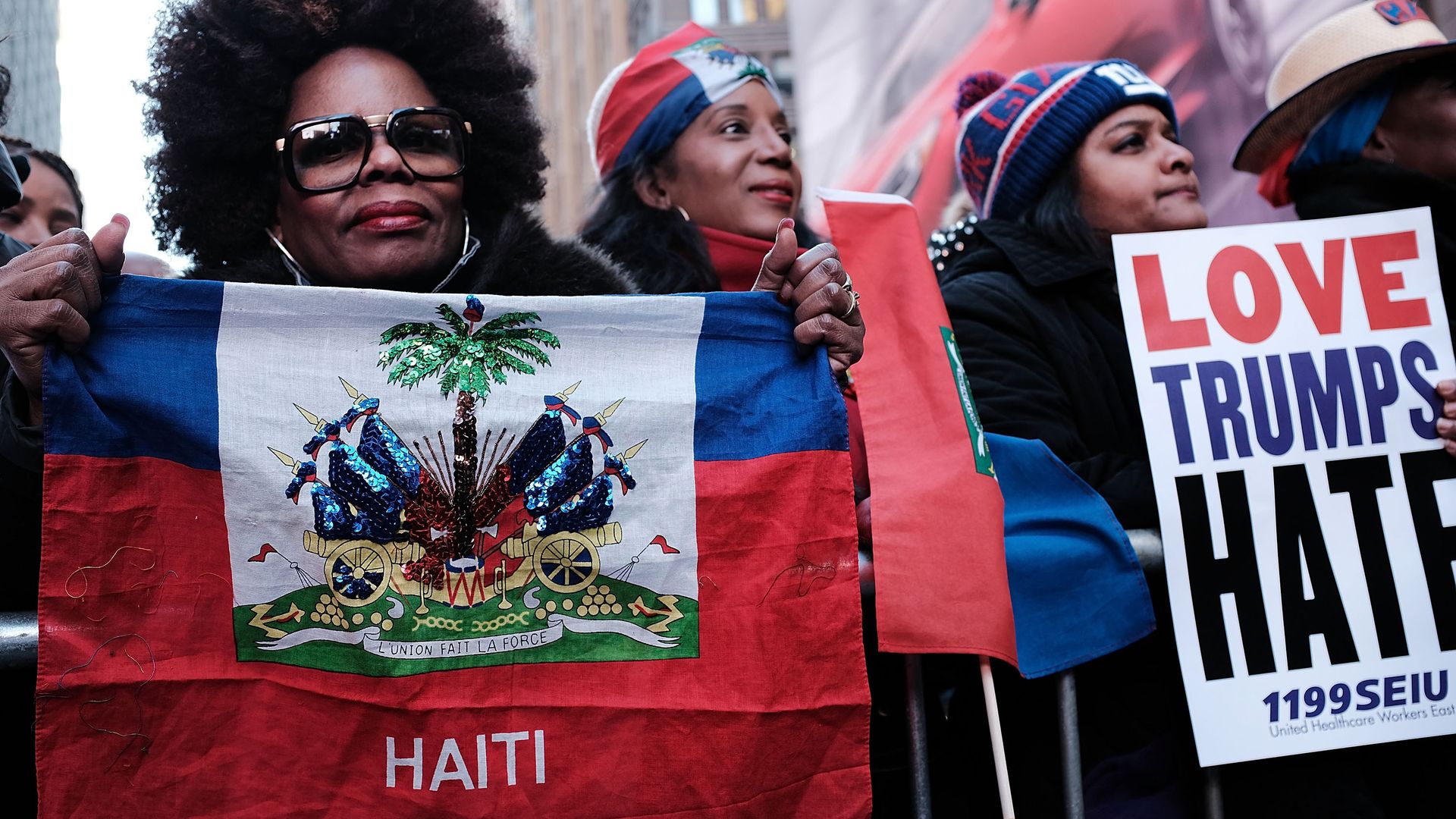 Haitians demonstrating in Times Square in response to recent comments made by President Trump that appeared to denigrate both Haiti and African nations during a meeting on immigration. Photo by Spencer Platt/Getty Images.