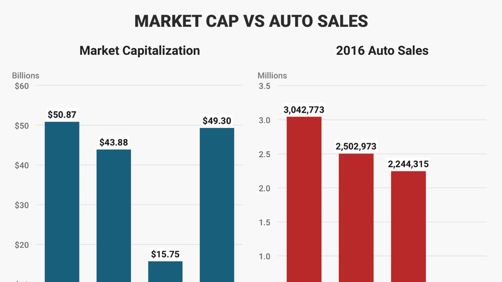 - The takeaway: "When it comes to the whole massive-market-cap-thing, however, we have been reminded that Tesla sells a remarkably small number of vehicles, relative to the traditional US Big Three: GM, Ford, and Fiat Chrysler Automobiles."