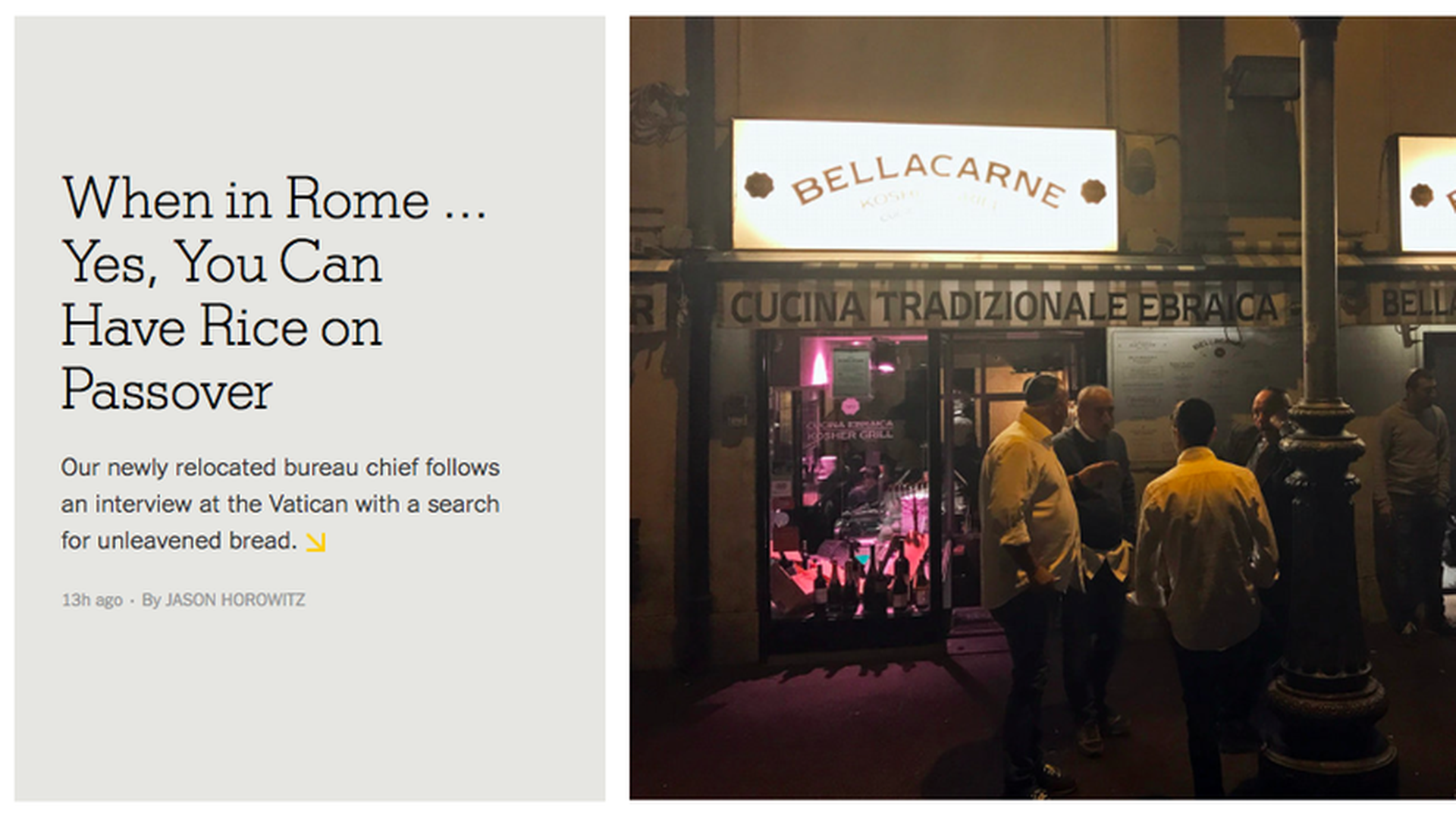 Jason Horowitz, the N.Y. Times' Rome bureau chief ("RTs = niente. Dammi uno dritta"), was prepared for a lonely Passover: