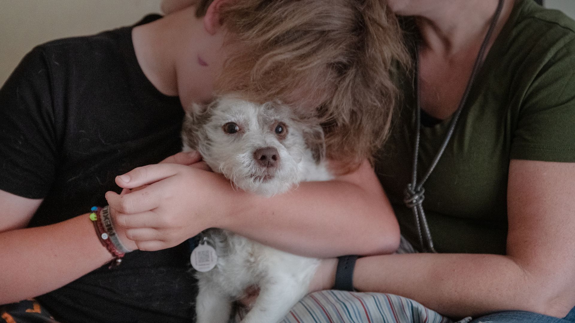 Erin Schneiderman and her 13-year old son play with the family dog, Ernie, at their home near City Park in Denver. Photo: Courtesy of Olivia Sun/Colorado Sun via Report for America/COLab