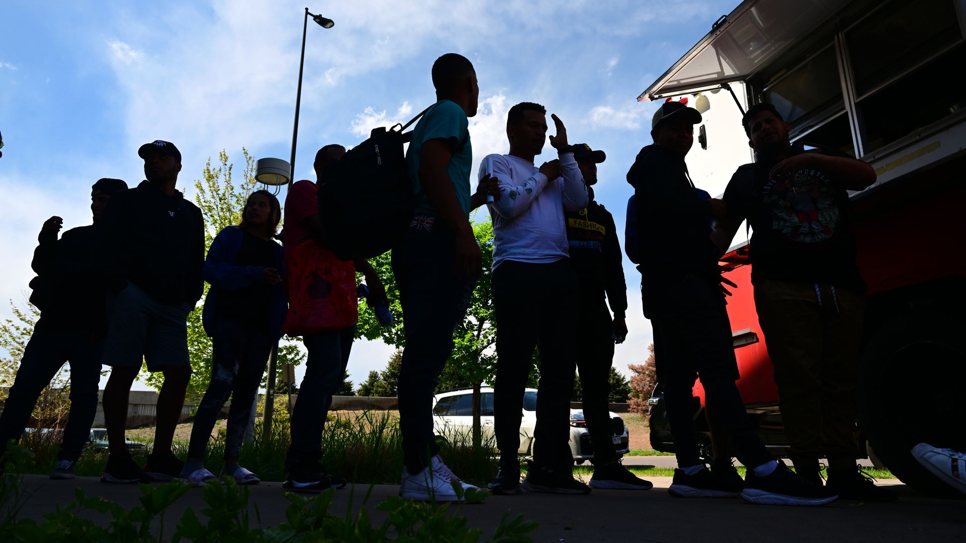 Venezuelan migrants wait in line for food from a food truck at a migrant processing center on May 9, 2023 in Denver, Colorado. Photo: Helen H. Richardson/MediaNews Group/The Denver Post via Getty Images