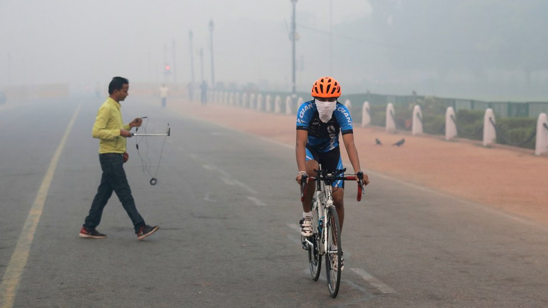A cyclist pedals through the smog in New Delhi, India, on Friday, Oct. 20, 2017. Photo: Manish Swarup / AP