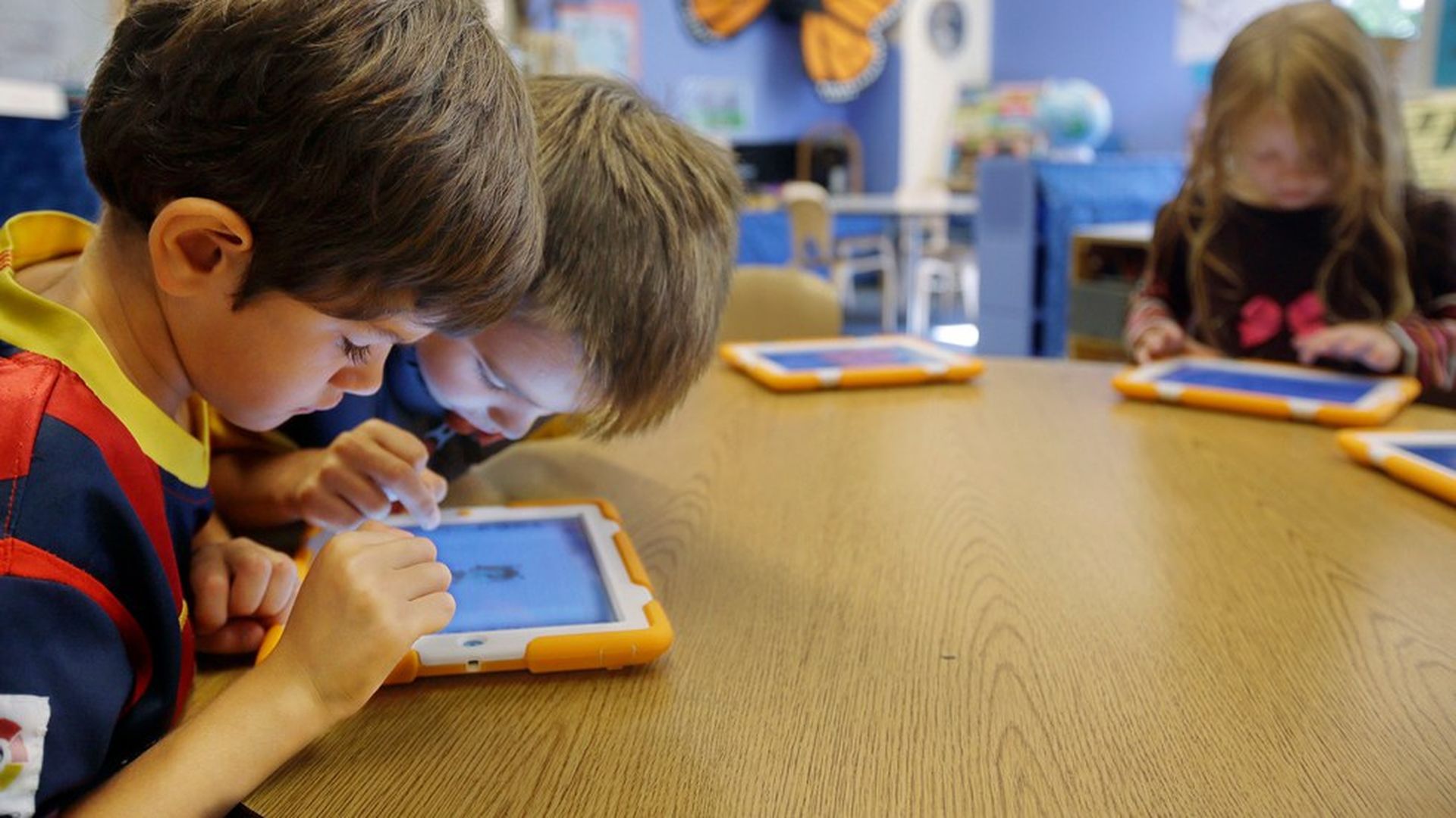 Kindergarteners use tablets to learn computer programming. Photo: Stephan Savoia / AP