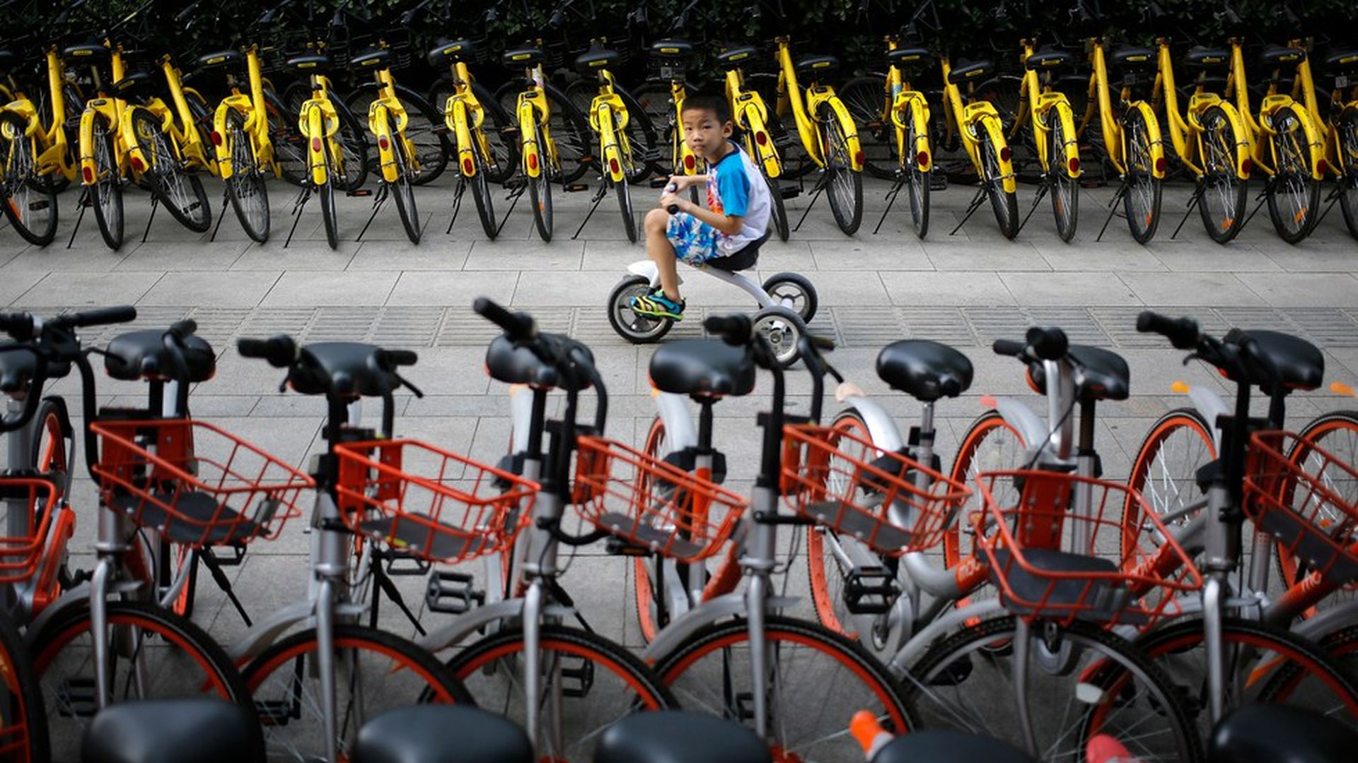A child rides past bicycles from bike-sharing companies parked along a sidewalk in Beijing. Photo: Andy Wong / AP