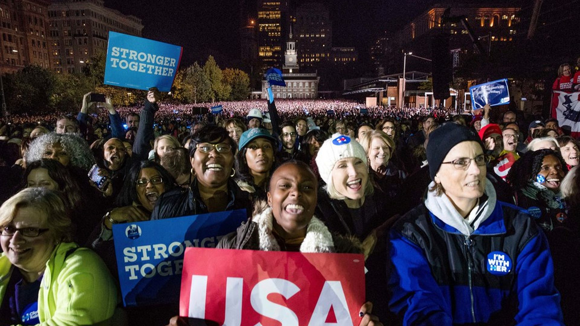 People gather on Independence Mall to hear Hillary Clinton speak. Photo: Andrew Harnik / AP