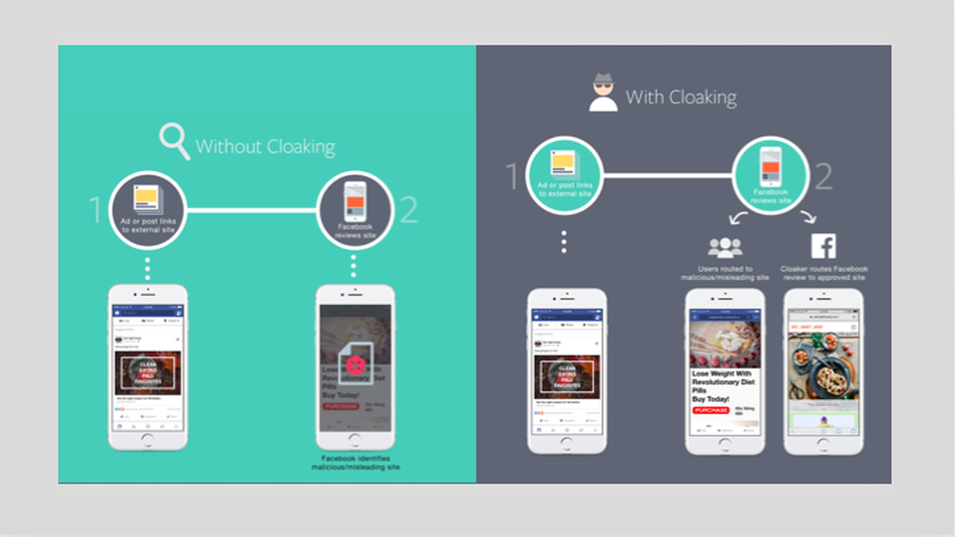 Facebook has introduced new steps it's taking to crack down on "cloaking," or the practice of circumventing ad and content review checks by Facebook to get people to click on something they aren't expecting, often diet pill scams or pornography sites.