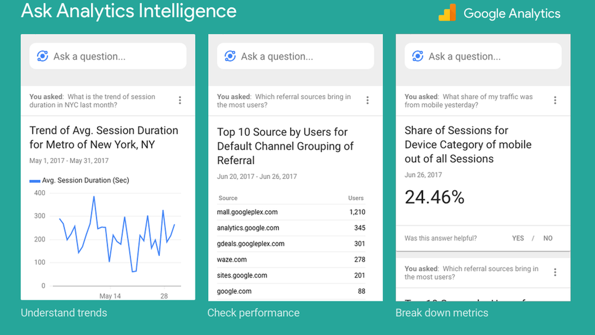 Google is bringing "Analytics Intelligence" (its marketing analytics machine-learning tool) to users on desktop and within its Analytics mobile app. They're also launching an "ask a question" feature that gives users the option to speak their questions.