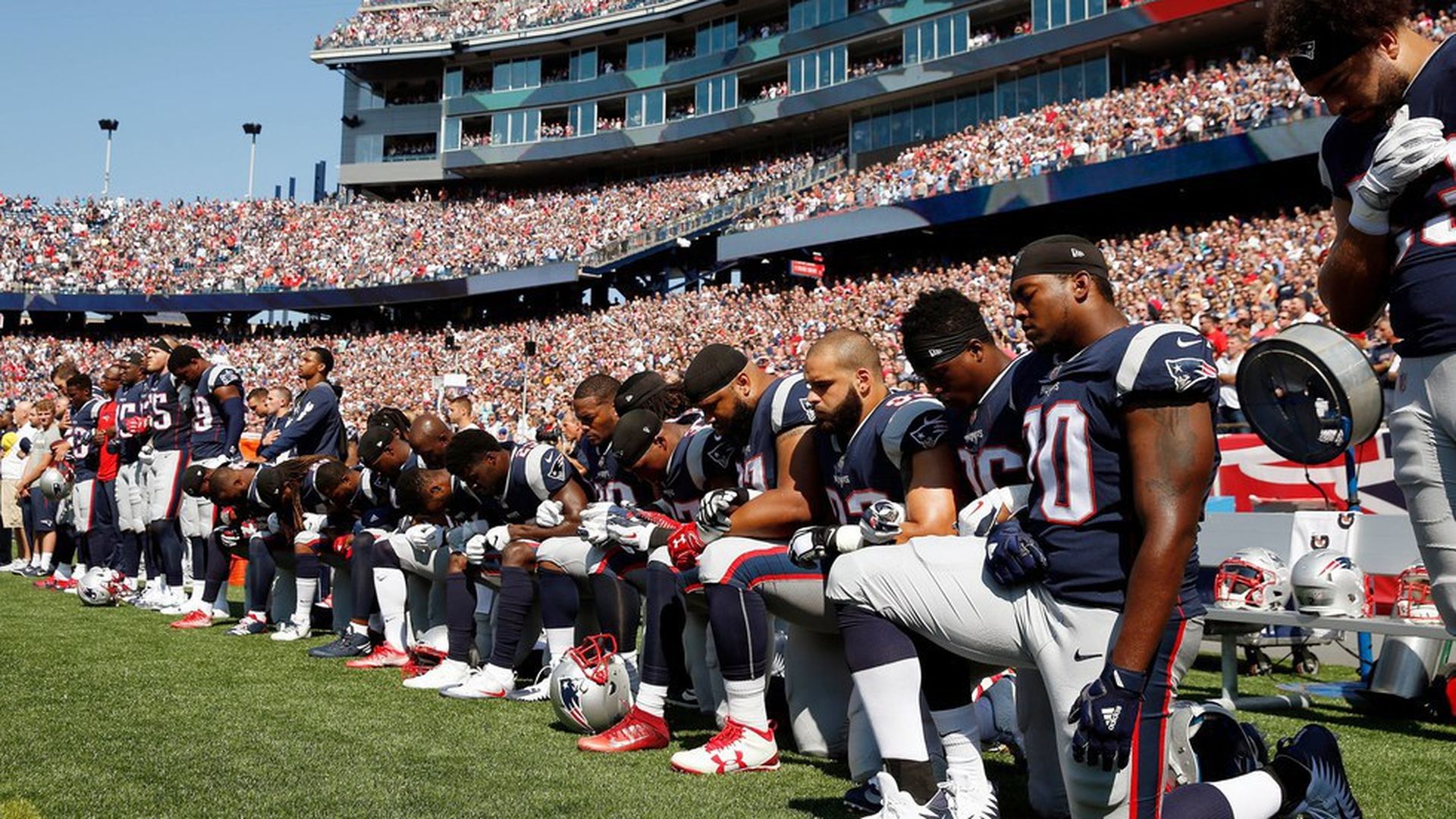 The New England Patriots kneel during the national anthem before a game. Photo: Michael Dwyer / AP