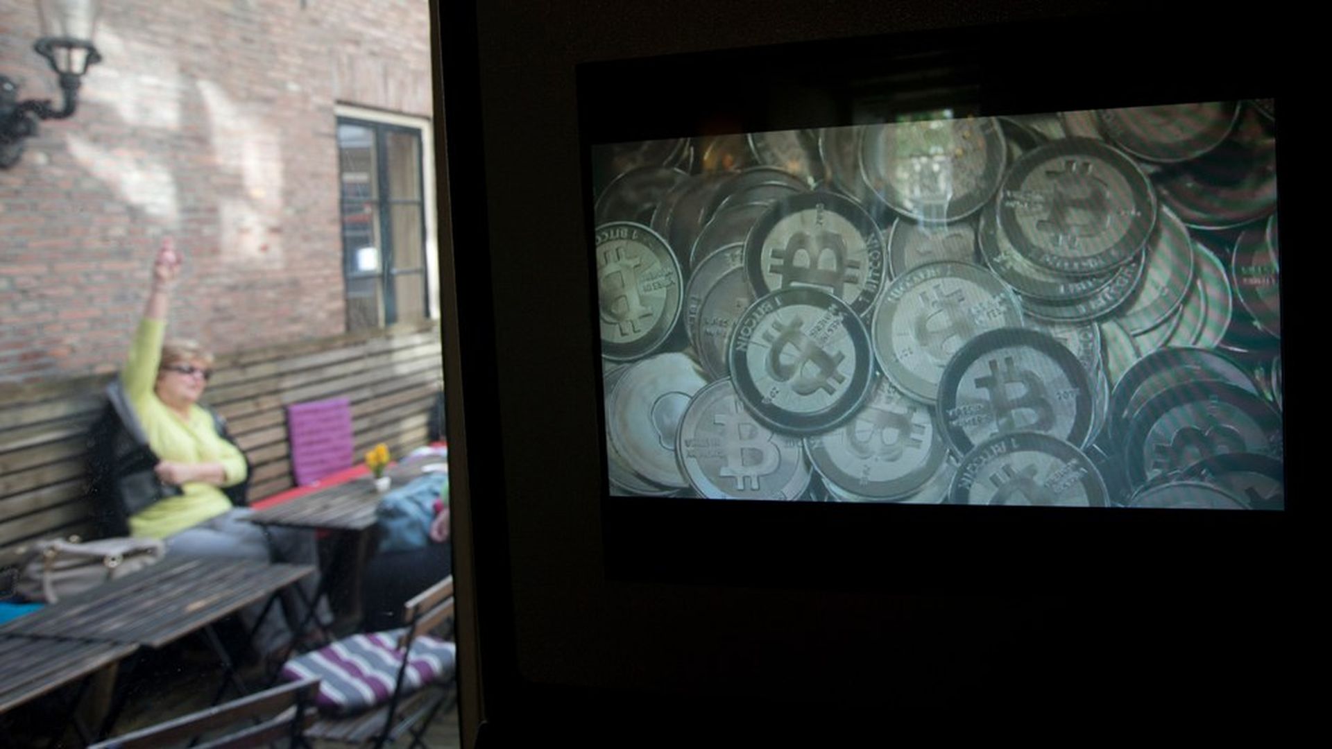 A screen of an ATM cash-to-bitcoin machine flashes an image of the virtual coins. Photo: Peter Dejong / AP