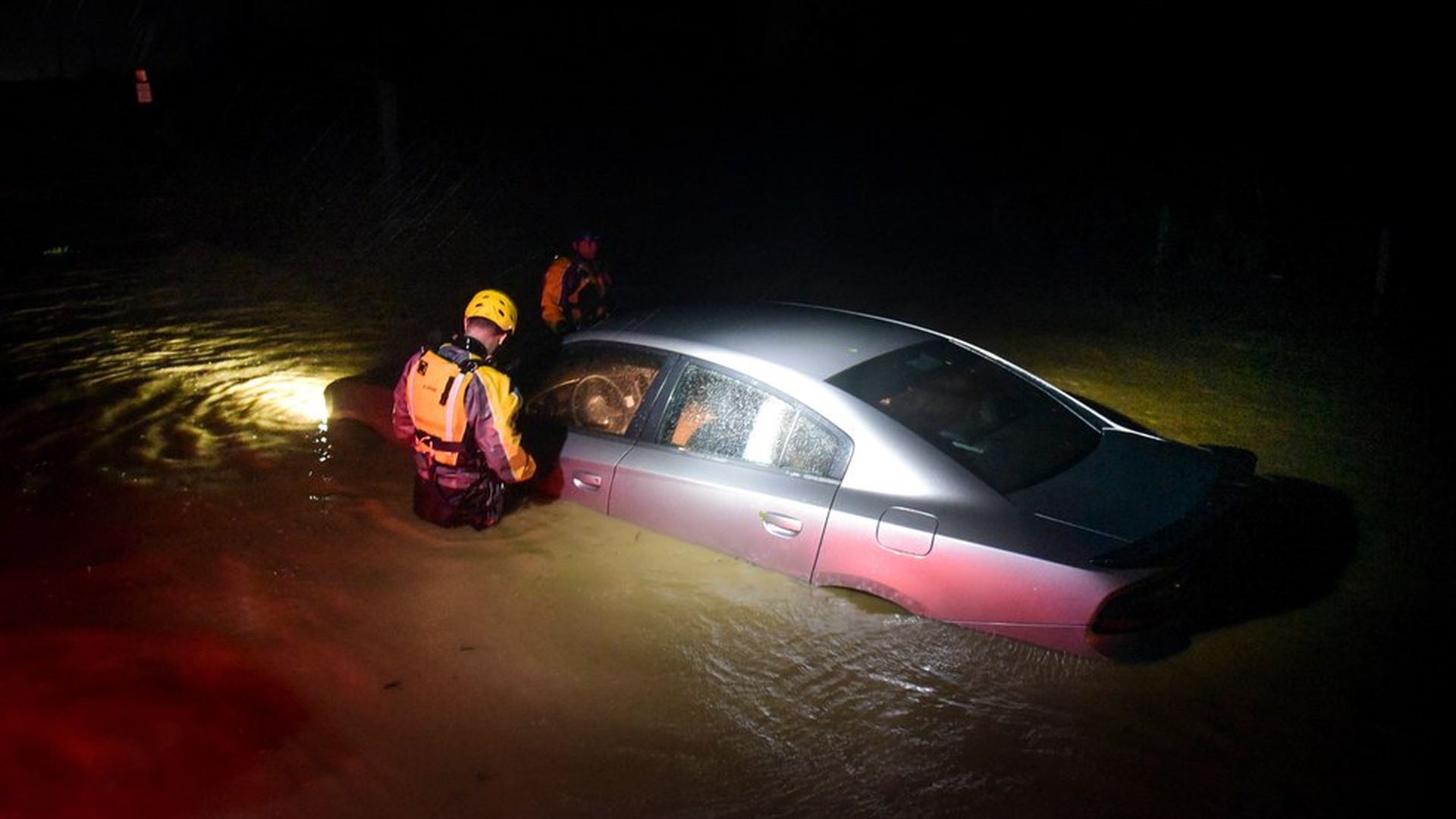 Rescue staff from the Municipal Emergency Management Agency investigate an empty flooded car during the passage of Hurricane Irma through the northeastern part of the island in Fajardo, Puerto Rico, Wednesday, Sept. 6, 2017 (Carlos Giusti / AP)