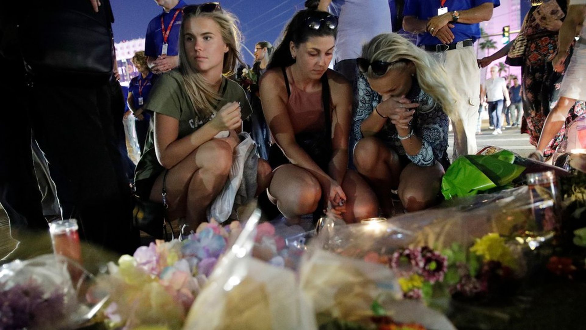 People pause at a memorial set up for victims of a mass shooting in Las Vegas. Photo: John Locher / AP