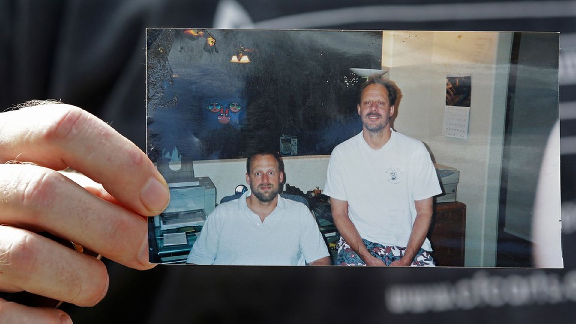 Eric Paddock holds a photo of him, at left, and his brother, Stephen Paddock, at right, outside his home. Photo: John Raoux / AP