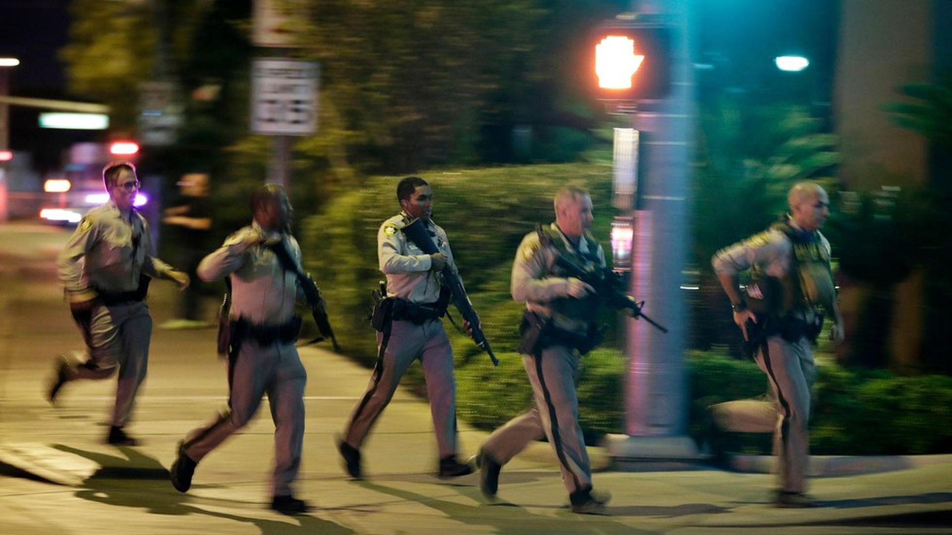 Police run to cover at the scene of a shooting near the Mandalay Bay resort and casino on the Las Vegas Strip, Sunday, Oct. 1, 2017, in Las Vegas. Photo: John Locher / AP