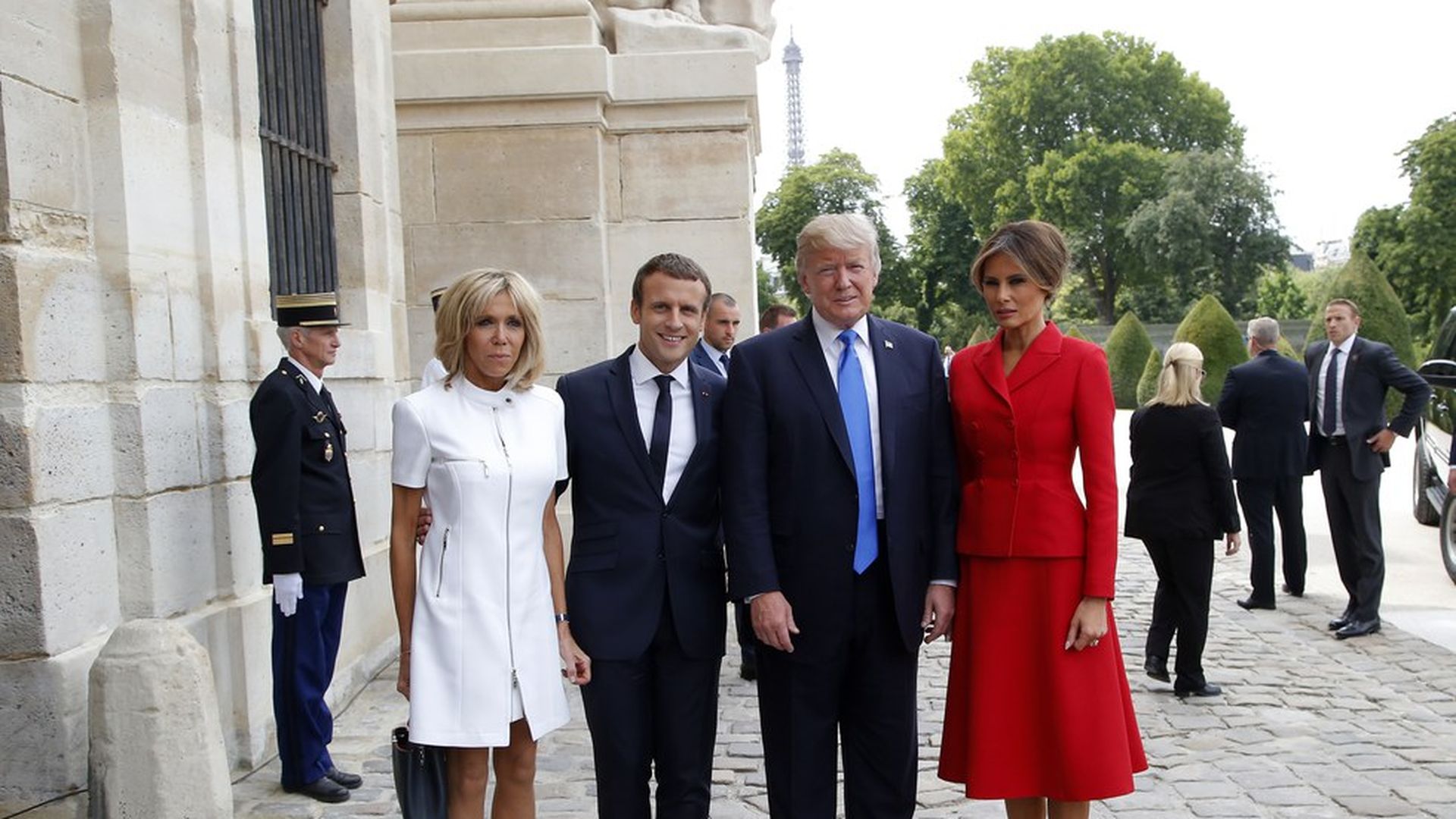 The tour: They toured the complex together with their first ladies and appeared to walk leisurely, visiting the tomb of Napoleon. Per the pool, "When POTUS and FLOTUS started walking again, your pooler saw Macron tap his wife on the rear end. She looked surprised and smiled."
