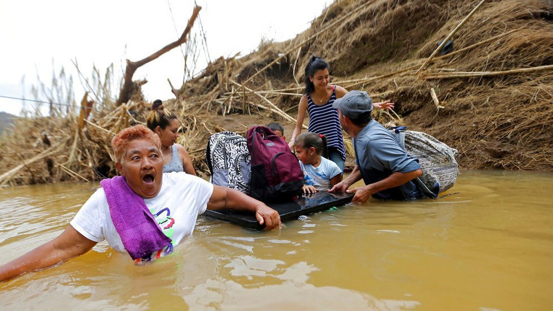 Marta Sostre Vazquez reacts as she wades into the San Lorenzo Morovis River with her family on Wednesday after a bridge was swept away. The family was returning to their home after visiting family on the other side. Photo: Gerald Herbert / AP