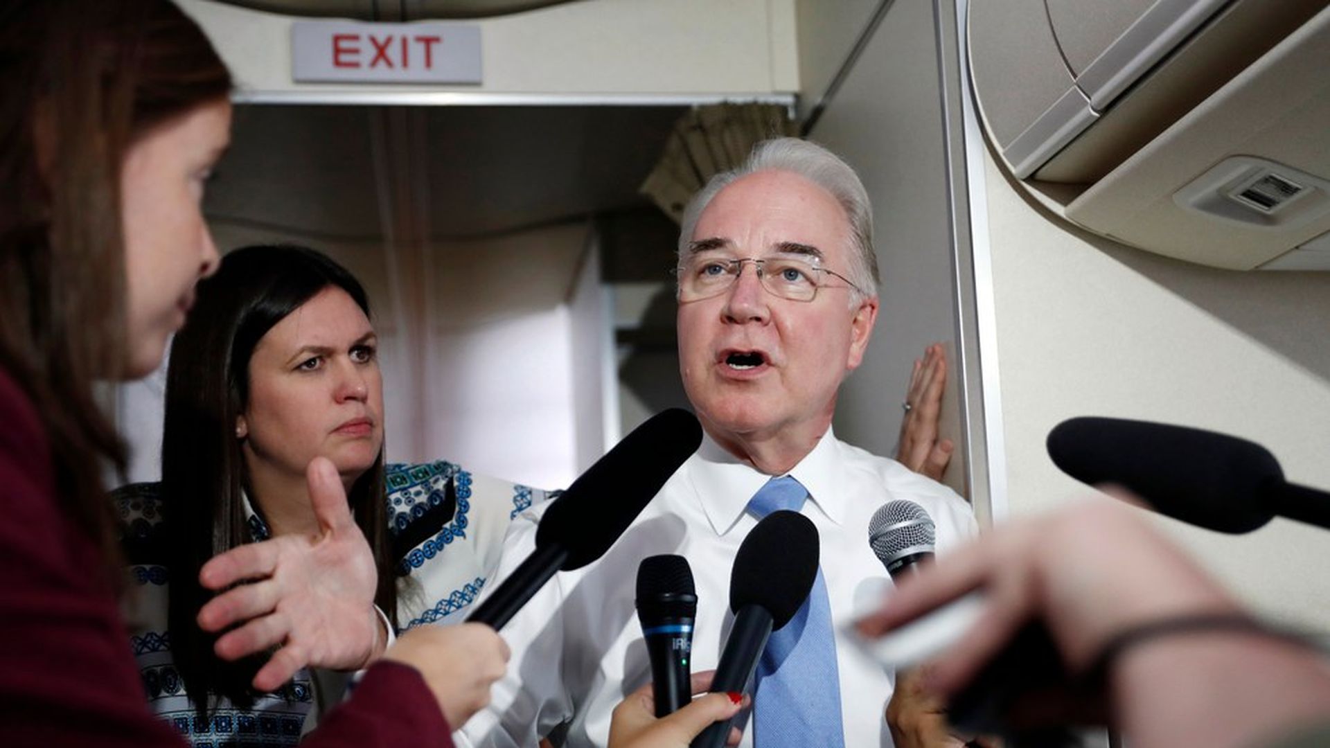 Tom Price, joined by White House press secretary Sarah Huckabee Sanders, speaks to media aboard Air Force One. Photo: Carolyn Kaster / AP