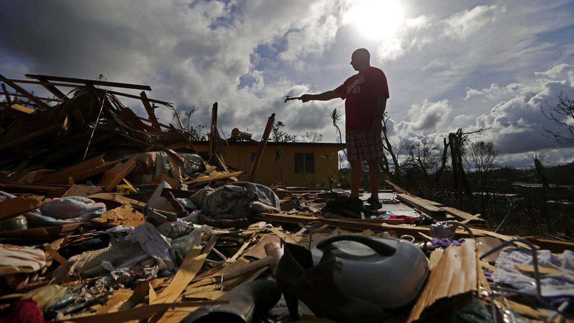 Jose Garcia Vicente holds a piece of plumbing he picked up as he shows his destroyed home in Aibonito, Puerto Rico yesterday. Photo: Gerald Herbert / AP