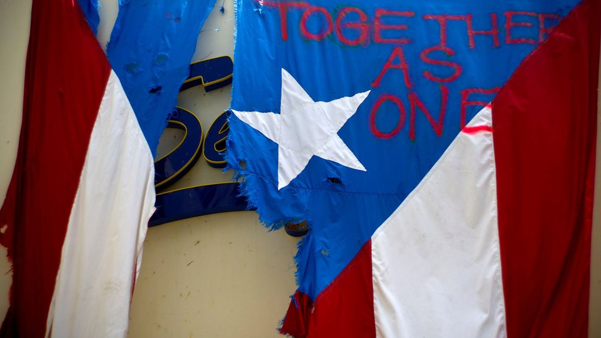 A damaged Puerto Rican flag hangs from the facade of a building. Photo: Ramon Espinosa / AP