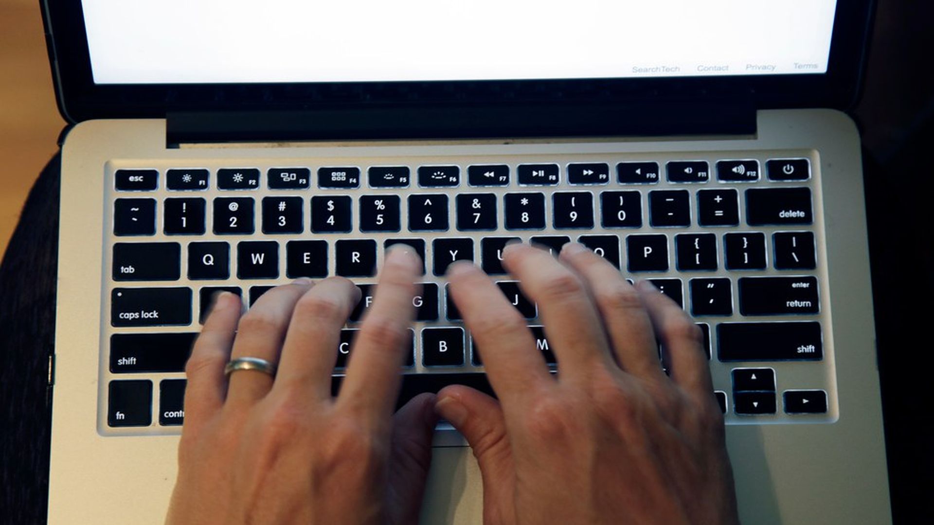 This photo shows fingers on a laptop keyboard in North Andover, Mass. Elise Amendola / AP