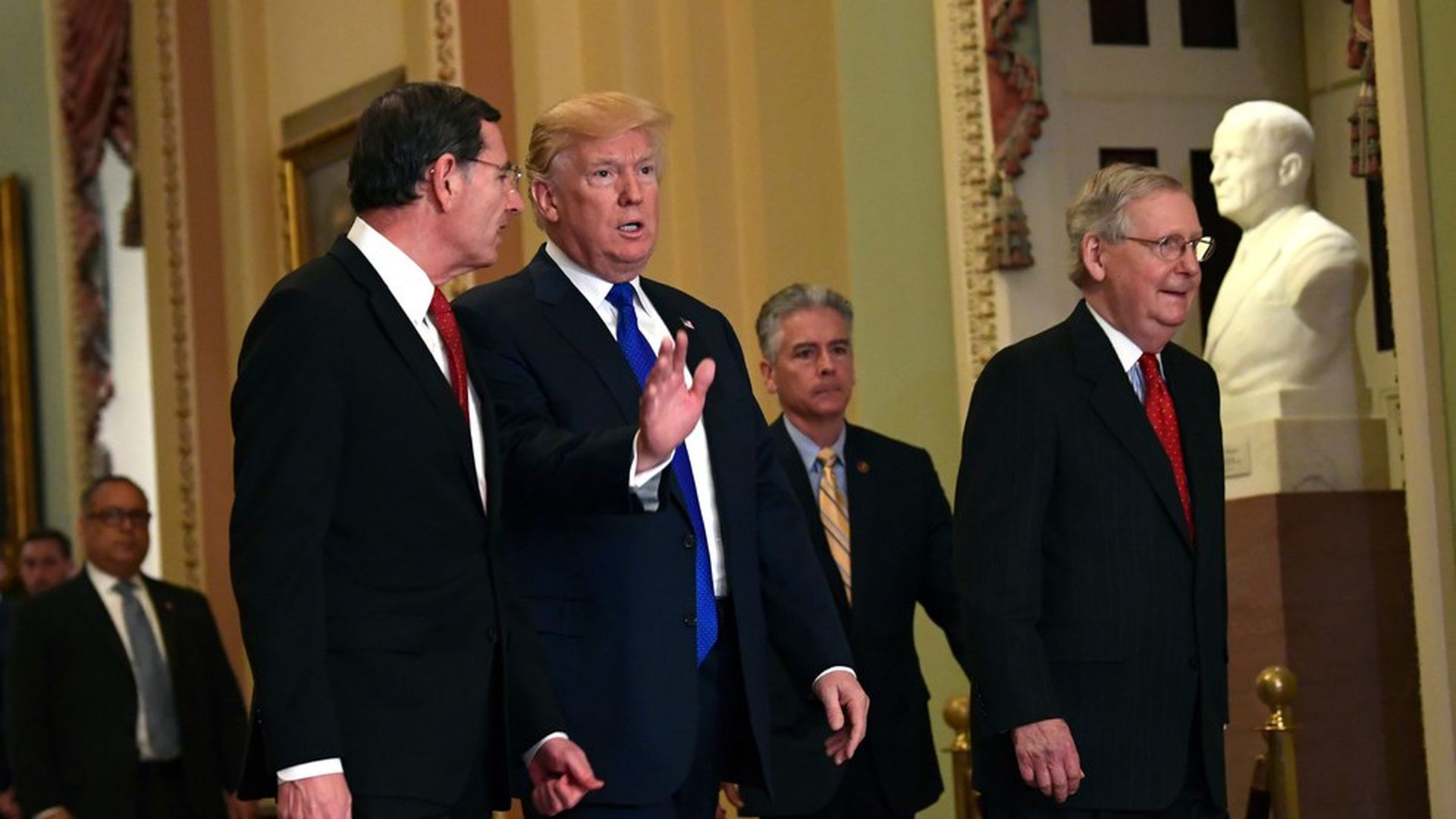 Trump walks with Sens. Barrasso (L) and McConnell. Photo: Susan Walsh / AP