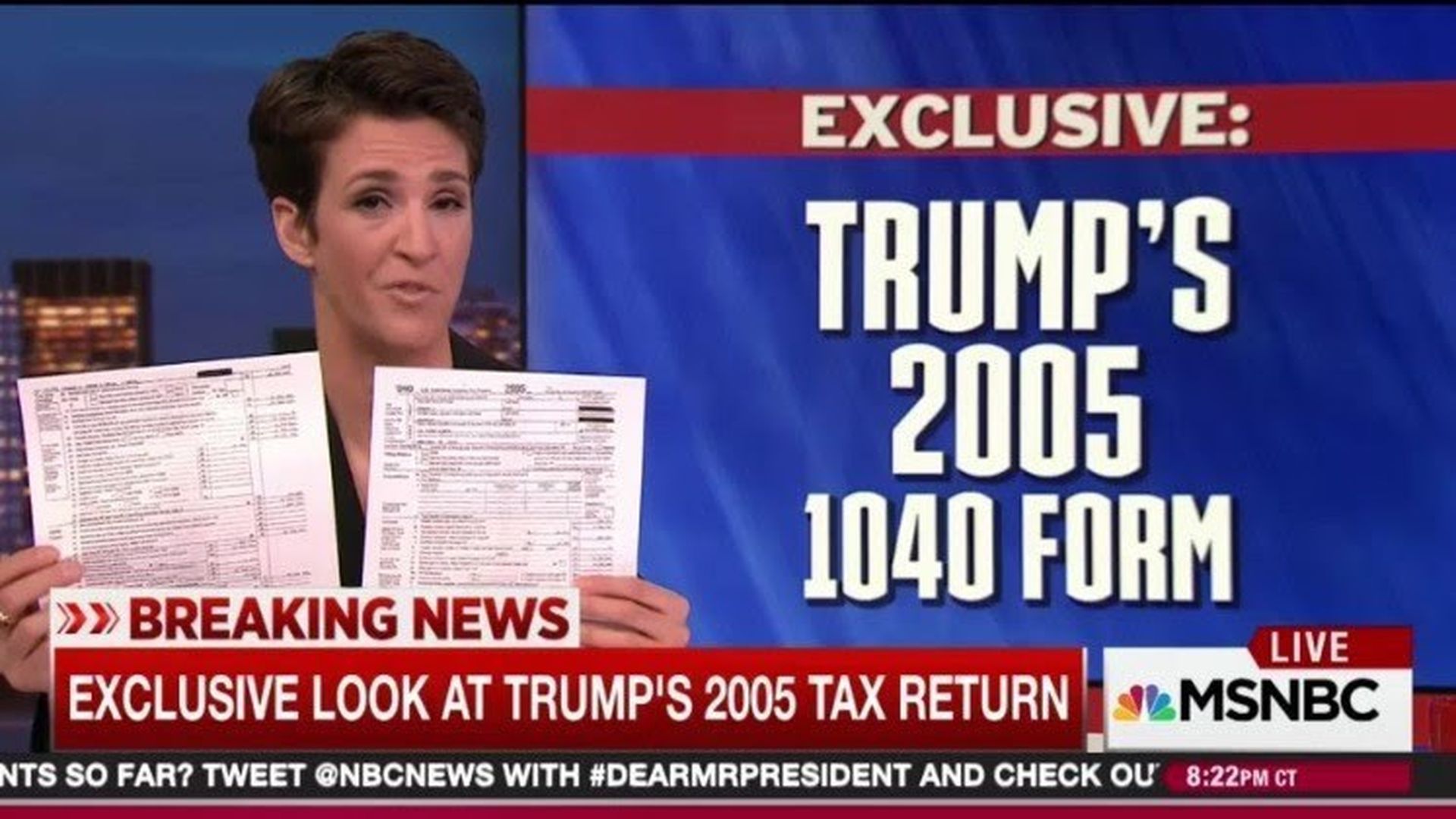 - Maddow to Lawrence O'Donnell: "I don't think there's any reason to ... expect that this will be the only Trump tax document that ever comes to light. ... [T]he more we learn about this, the closer we're going get to the truth about whether or not his foreign entanglements explain more about what just happened in our election."