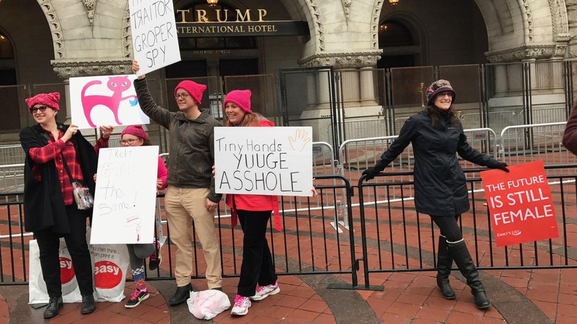 Thousands of protesters have gathered near the Capitol (and stopped at Trump International Hotel) for the Women's March on Washington. They are set to begin marching at 1:15 p.m., with at least 200,000 attendees expected.