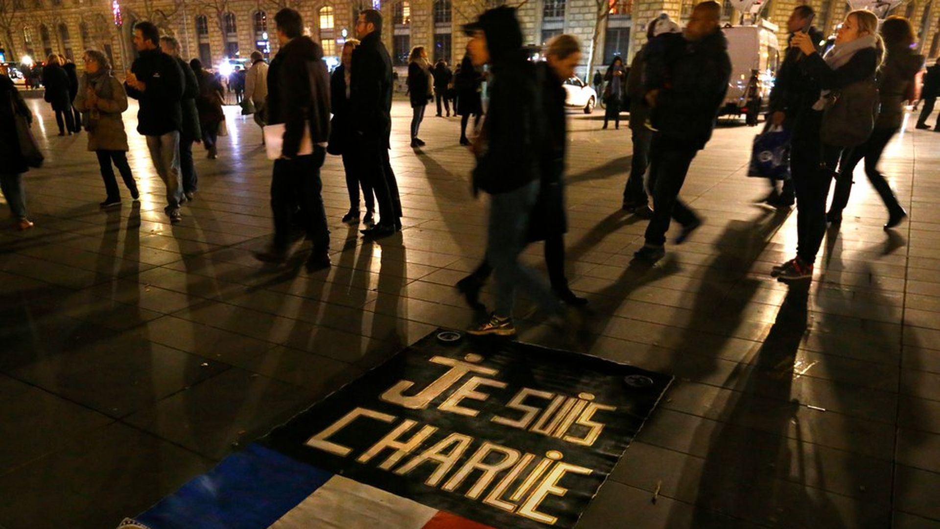 People walk around to banner reading "Je suis Charlie", "I am Charlie" on the Place de la Republique. Photo: Francois Mori / AP