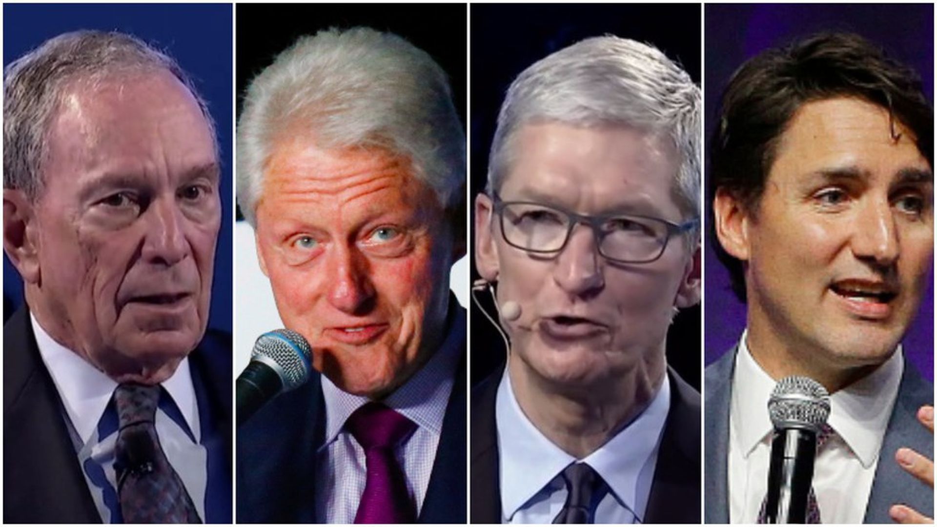 From left: Mike Bloomberg, Bill Clinton, Tim Cook, and Justin Trudeau. Photos: Bloomberg Global Business Forum and AP