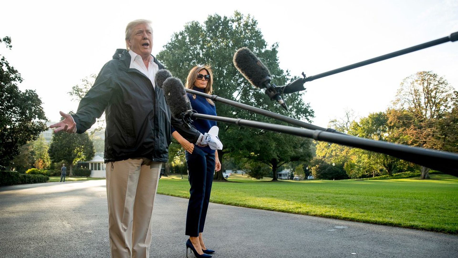 President Trump, accompanied by Melania, talks to reporters before boarding Marine One on the South Lawn of the White House. Photo: Andrew Harnik / AP