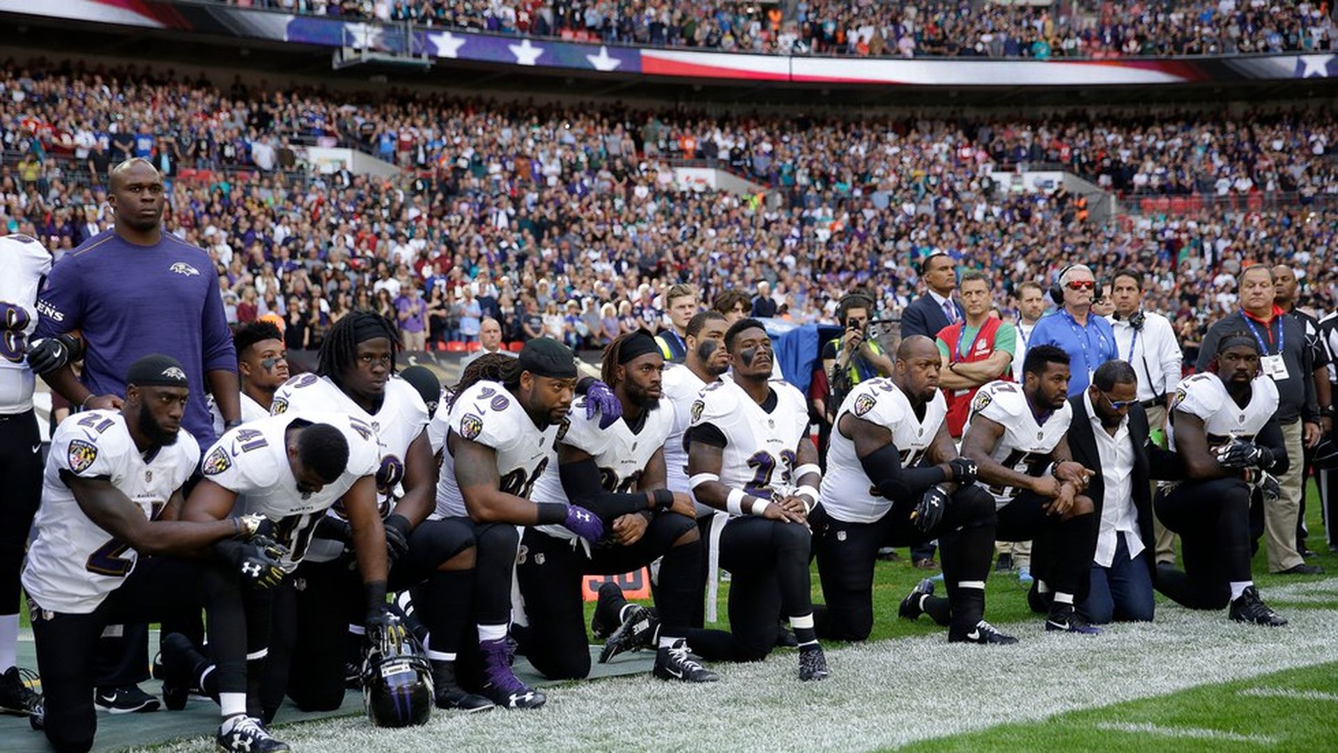 Baltimore Ravens players kneel in protest. Photo: AP / Matt Dunham