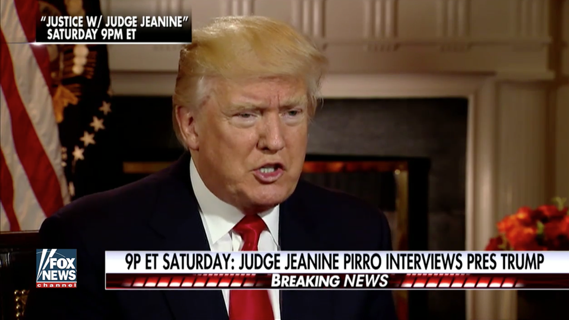 Trump's sit-down interview with Jeanine Pirro aired tonight on her Fox News show "Justice with Judge Jeanine" and, unsurprisingly, James Comey was still a hot topic of discussion. They talked about Trump's presidency and a bit about his policies, but Pirro went for the Comey questions right at the start — and Trump revealed two somewhat surprising things: