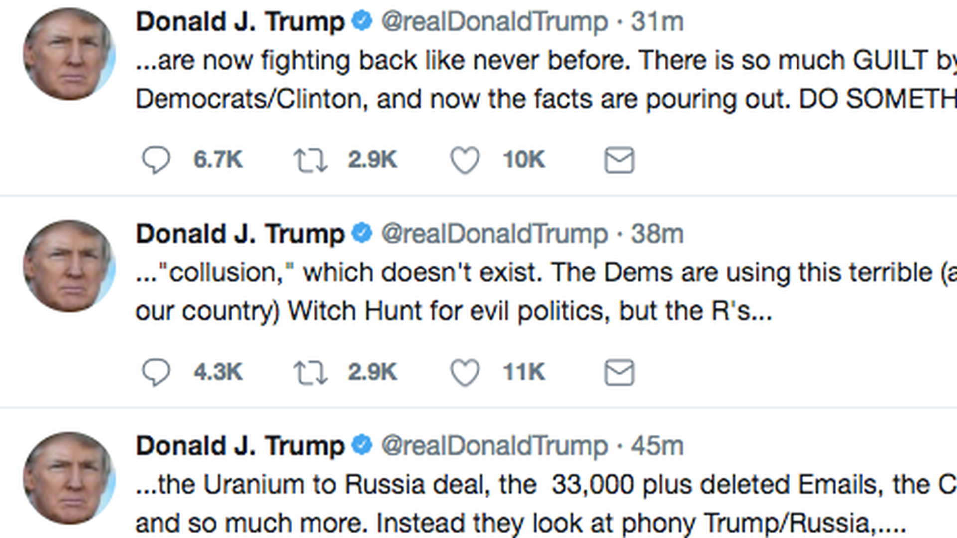 President Trump sent a stream of four tweets Sunday morning denying any collusion between his campaign and Russia and attempting to shift the focus onto Hillary Clinton. A half hour later he followed up another: "All of this "Russia" talk right when the Republicans are making their big push for historic Tax Cuts & Reform. Is this coincidental? NOT!"