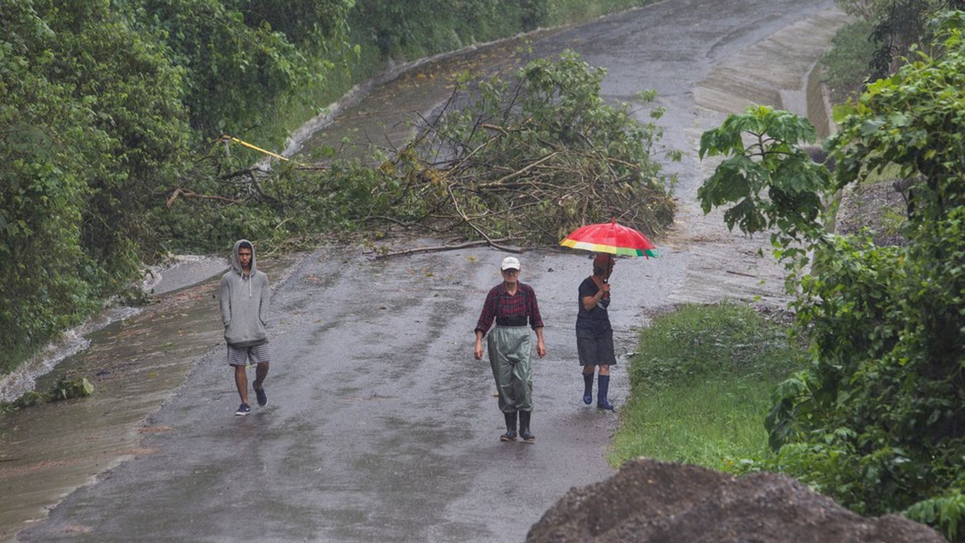 Costa Ricans walking along a washed out road in the rain after Hurricane Nate passed through earlier this week. Photo: Moises Castillo / AP