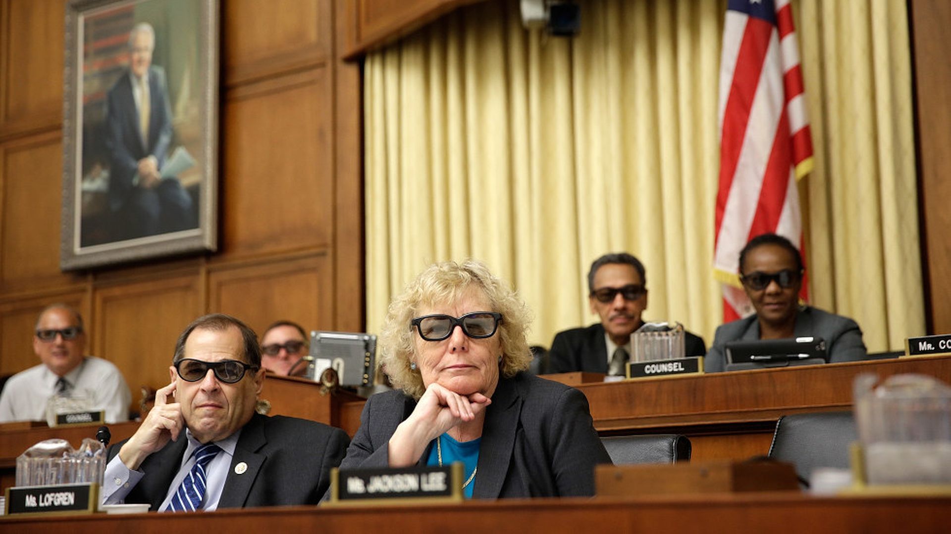 Reps. Jerry Nadler and Zoe Lofgren wearing 3D glasses. Photo: Win McNamee / Getty Images