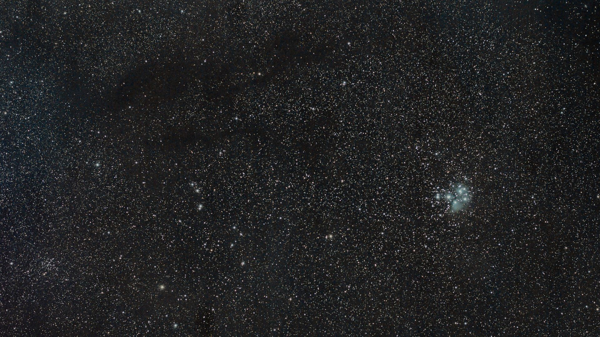 The Taurus Molecular Cloud is the dark, obscured region in the upper left of the image, where the gas and dust are blocking the stars behind the cloud from view. Taken from Charlottesville, VA on January 2, 2018. Credit: Brett A. McGuire
