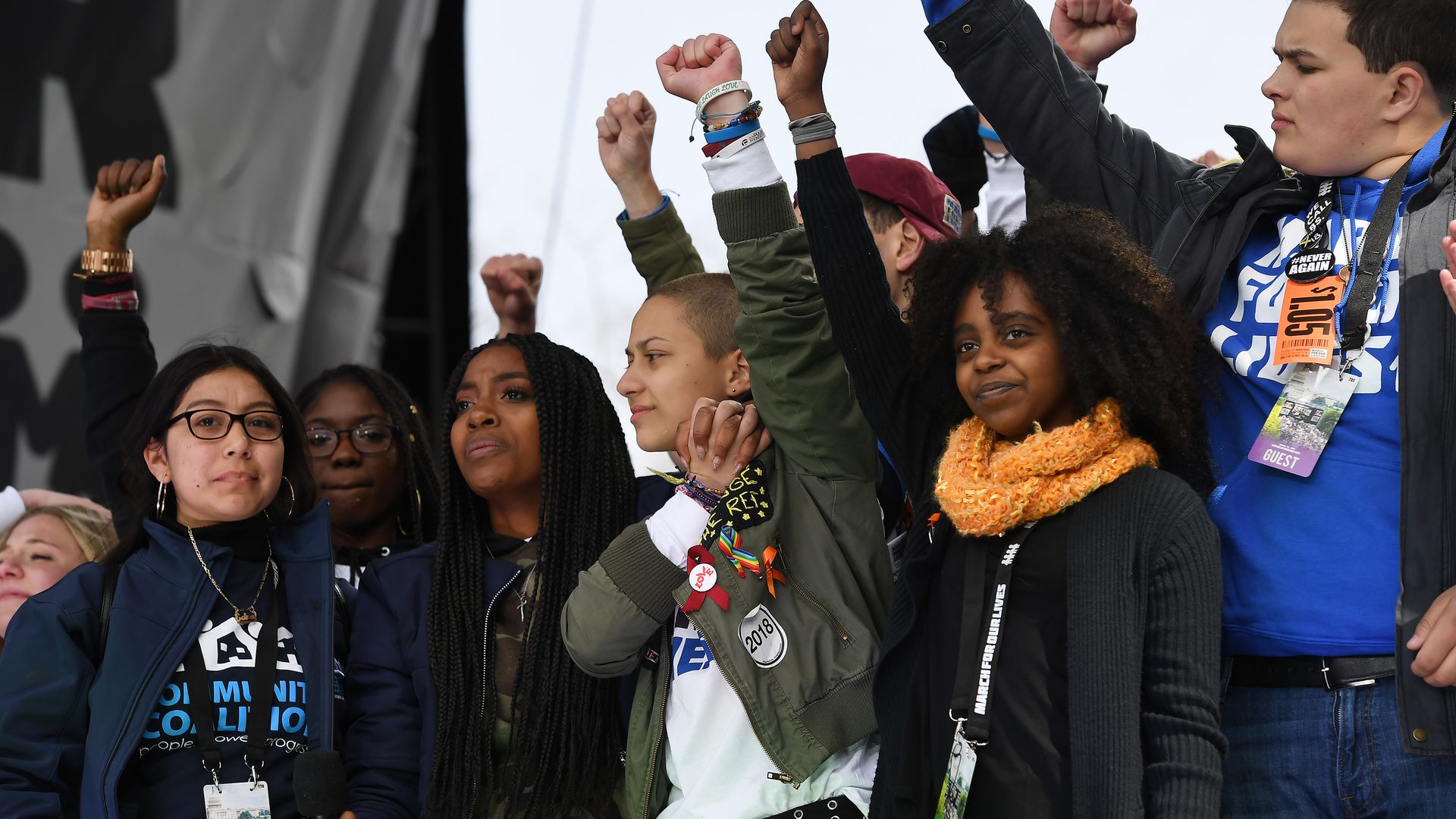 Marjory Stoneman Douglas High School student, Emma Gonzalez, center, stands next to Naomi Wadler, 11, right, near the conclusion of March for Our Lives in Washington. Photo: Matt McClain/The Washington Post via Getty Images