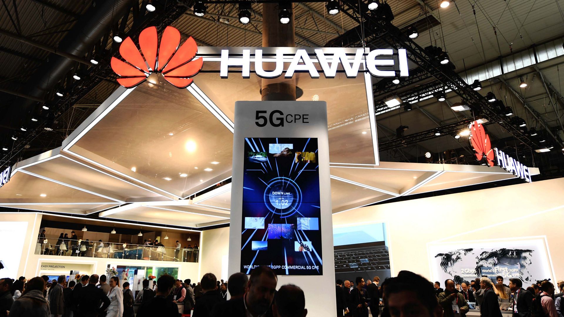 Huawei's 5G-focused booth at the 2018 Mobile World Congress in Barcelona, Spain. Photo: Xinhua/Guo Qiuda via Getty Images.