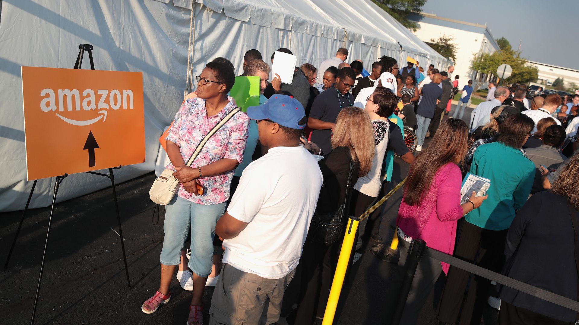 Job seekers wait in line to apply for jobs being offered at the Amazon fulfillment center in Romeoville, Illinois. Photo: Scott Olson/Getty Images