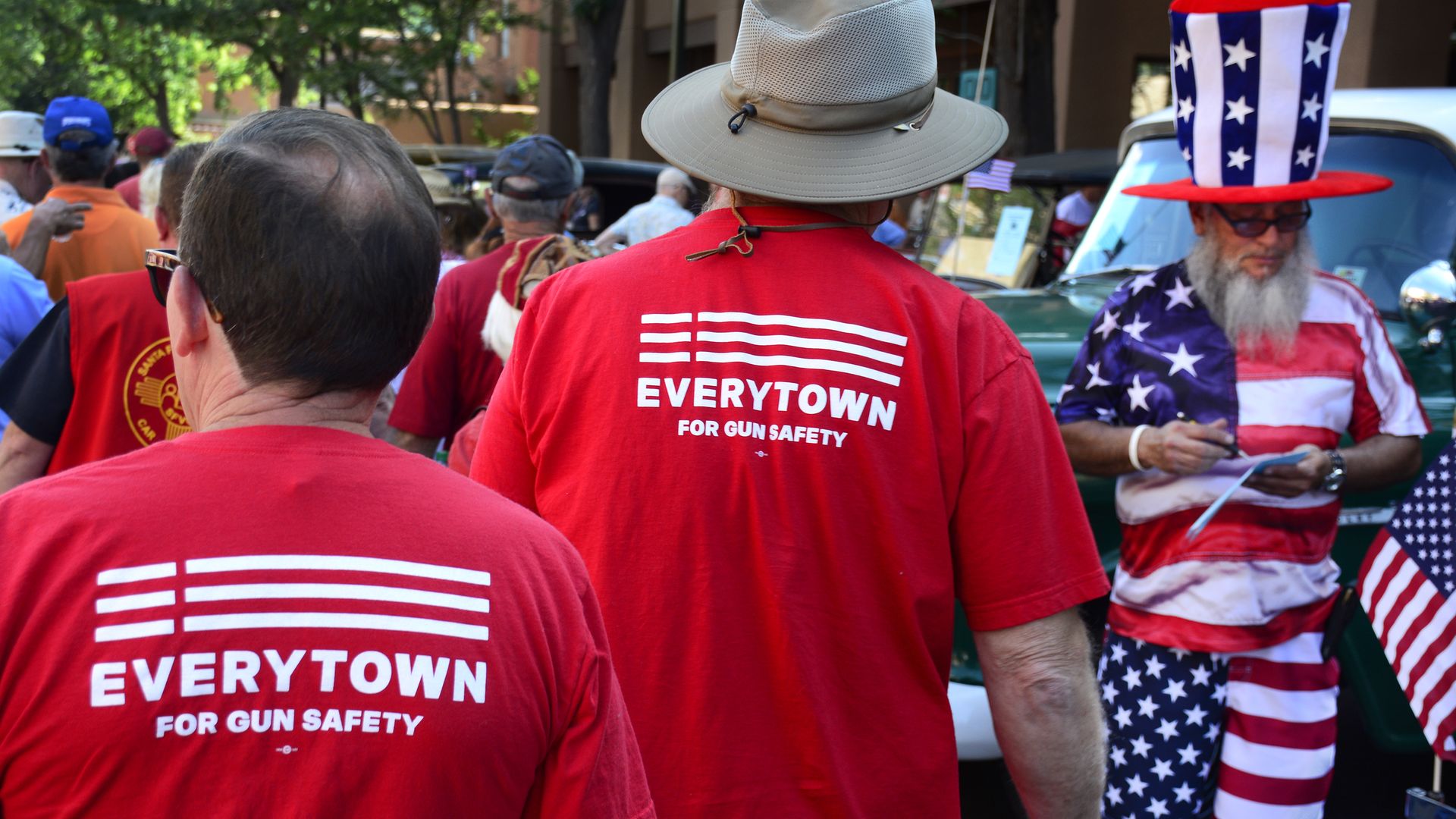 Two men wear "Moms Demand Action for Gun Sense in America" T-shirts at a Fourth of July celebration in Santa Fe, New Mexico. Photo: Robert Alexander/Getty Images