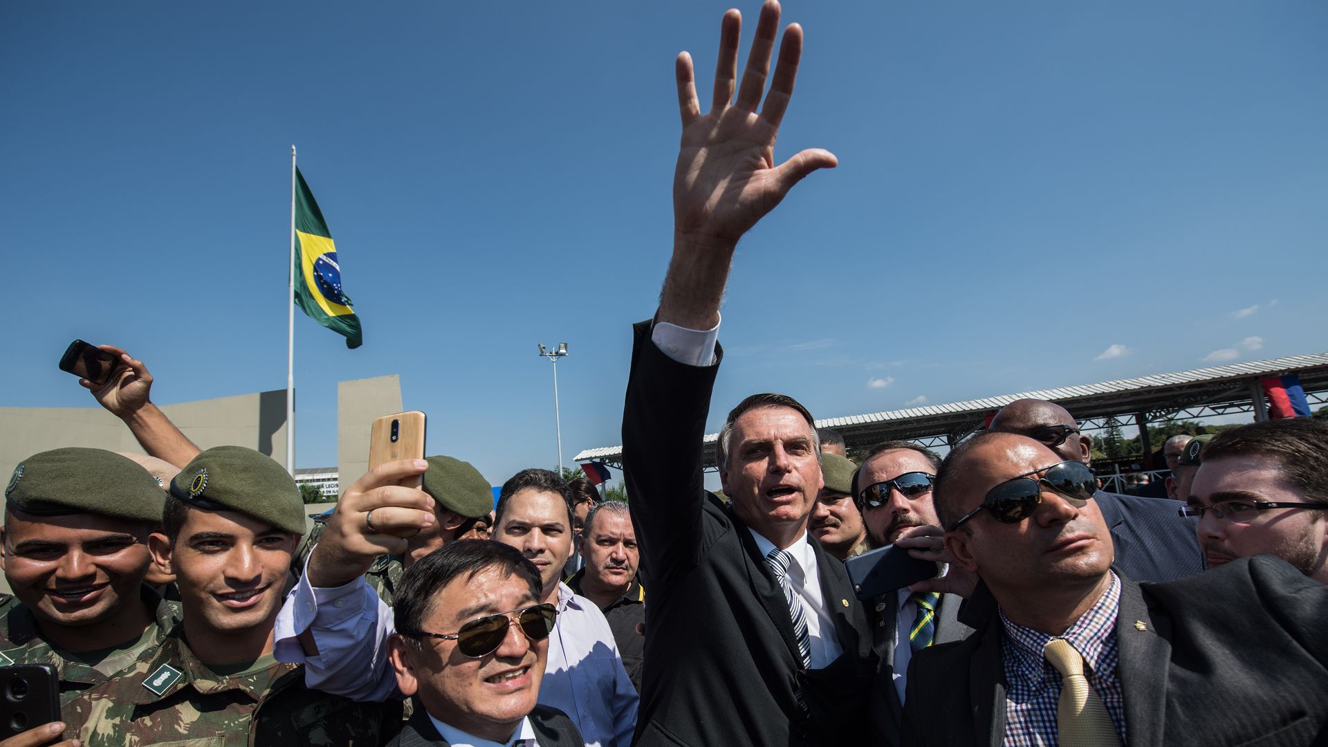Bolsonaro waves while at a military event. Photo: Nelson Almeida/AFP/Getty Images