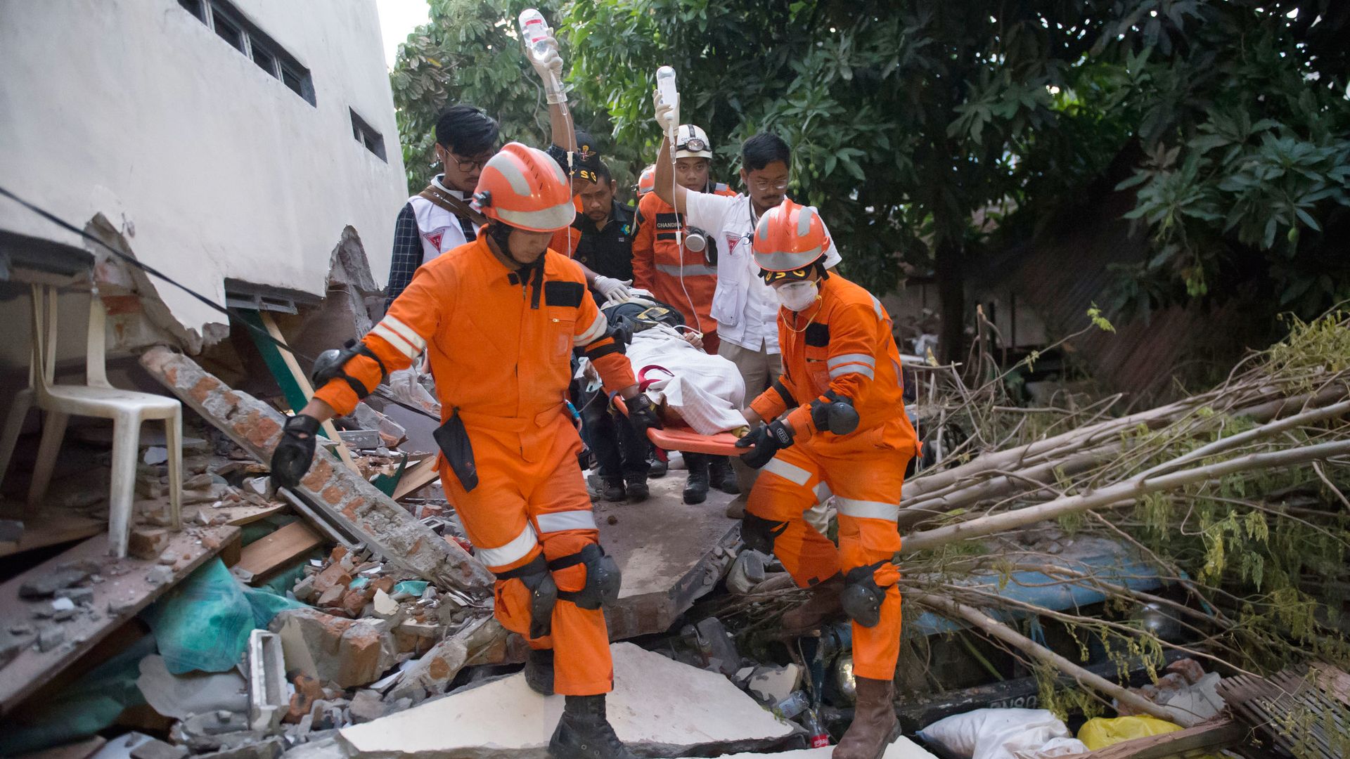 Rescue personnel evacuate an earthquake survivor. Photo: Bay Ismoyo/AFP/Getty Images