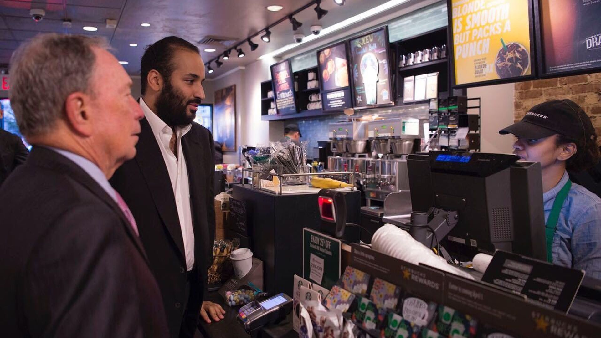 MBS and Mike Bloomberg order at a Starbucks in New York in March. Photo: Bandar Algaloud/Saudi Kingdom Council via Getty Images
