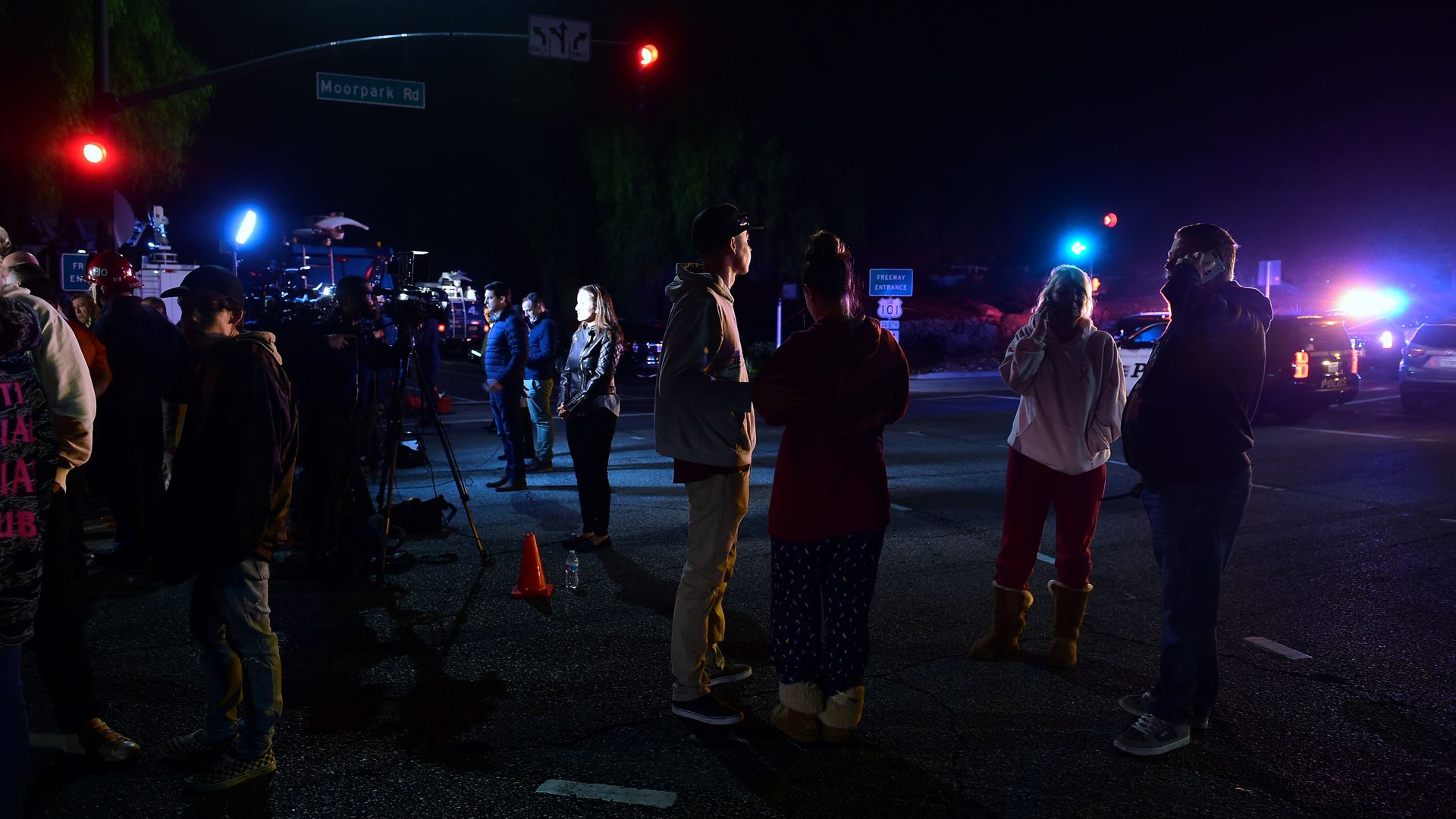 People stand and watch as police vehicles close off the area outside a country music bar and dance hall in Thousand Oaks, California. Photo: Frederic J. Brown/AFP/Getty Images