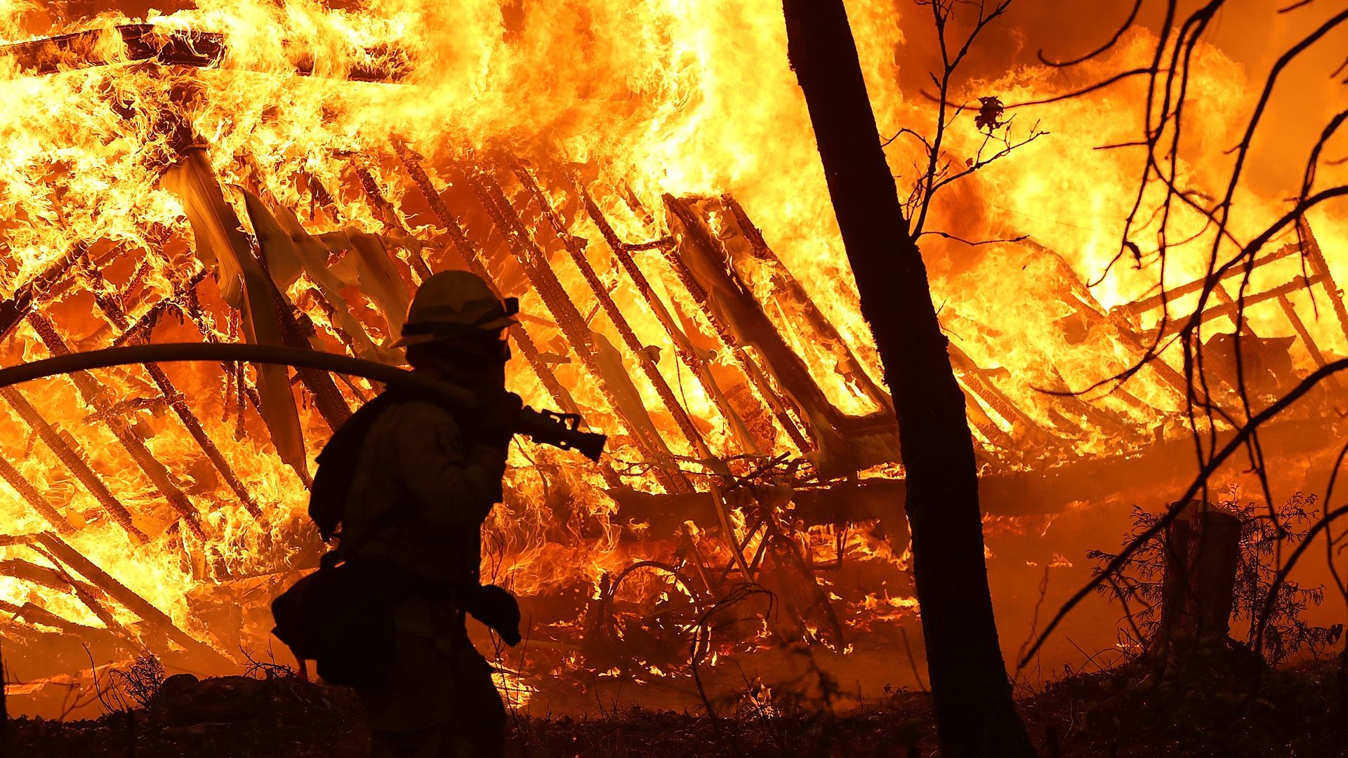 A Cal Fire firefighter monitors a burning home as the Camp Fire moves through the area. Photo: Justin Sullivan/Getty Images