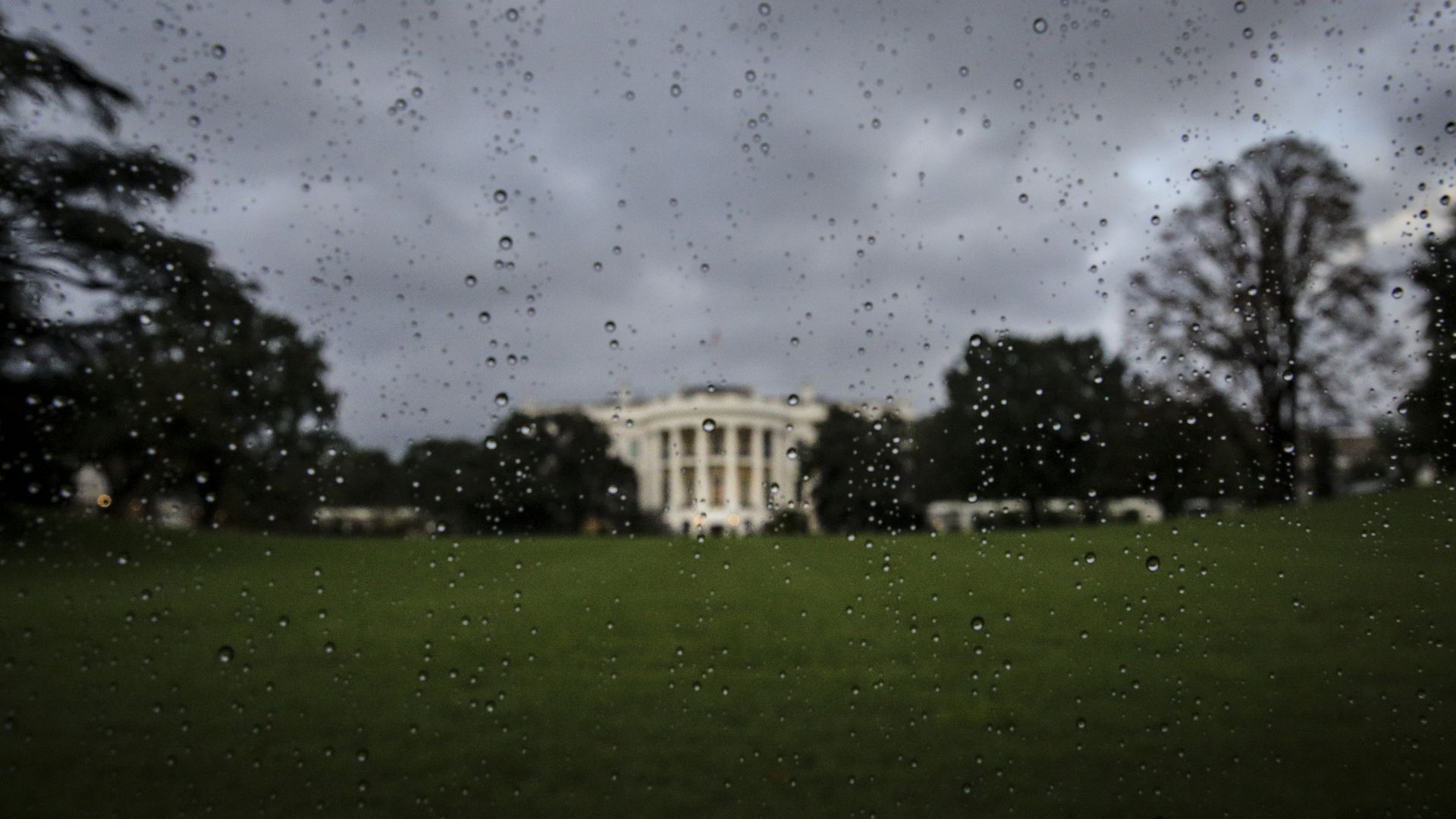 The South Lawn of the White House is seen from a car window covered with rain drops. Photo: Oliver Contreras-Pool/Getty Images