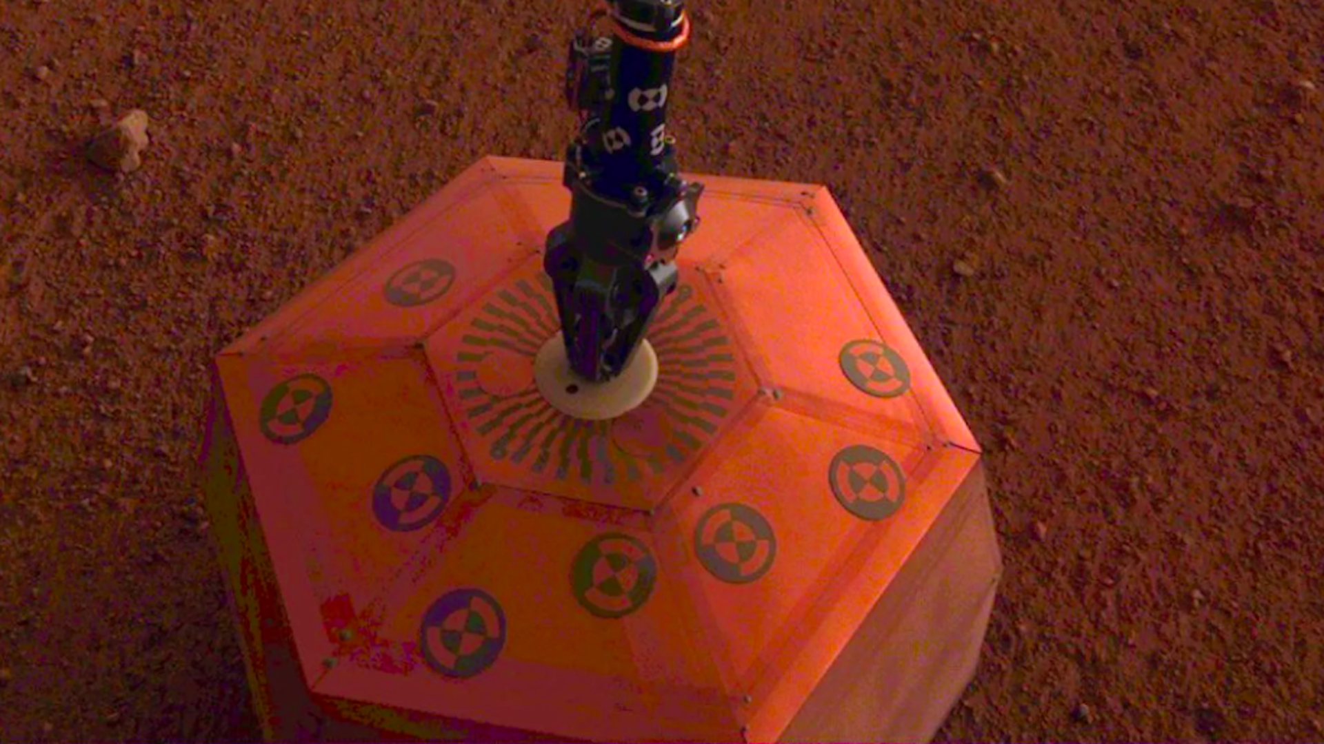 The Mars InSight lander's seismometer deployed on the surface of Mars. Image: NASA/JPL-Caltech