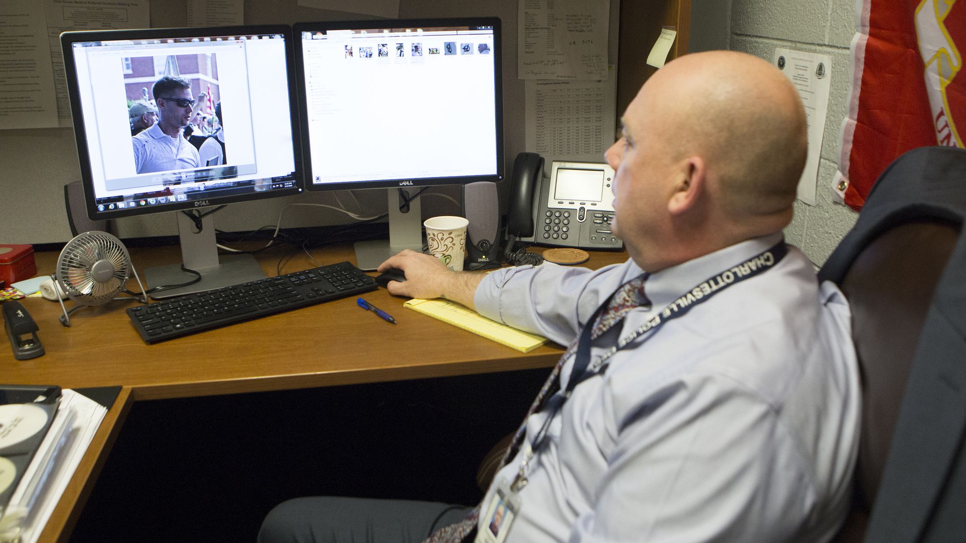 Charlottesville detective Declan Hickey views a photo of "Sunglasses," one of the suspects still at large in the attack. Photo: Julia Rendleman for the Washington Post via Getty Images