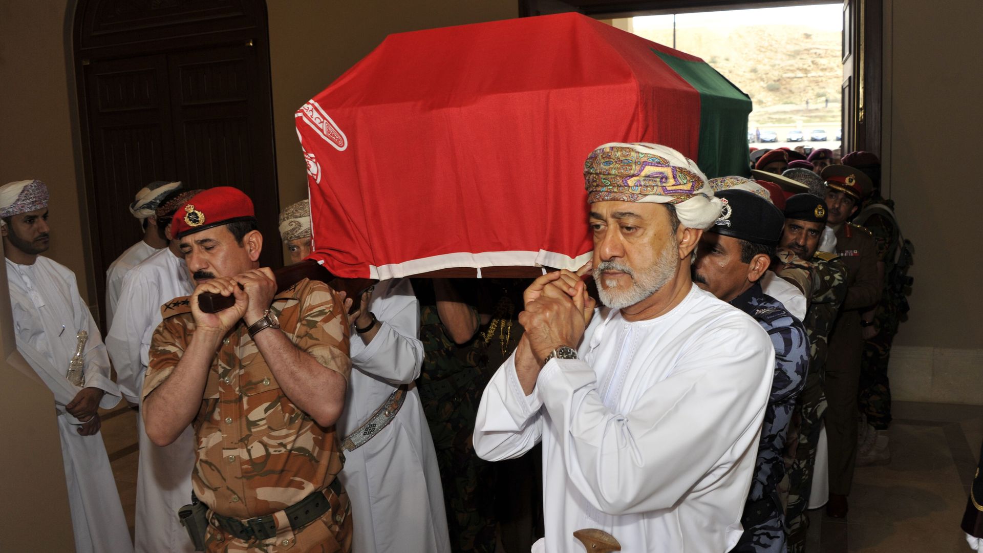 Sultan Haitham bin Tariq Al Said (R) helps carry the coffin of Sultan Qaboos. Photo: AFP via Getty